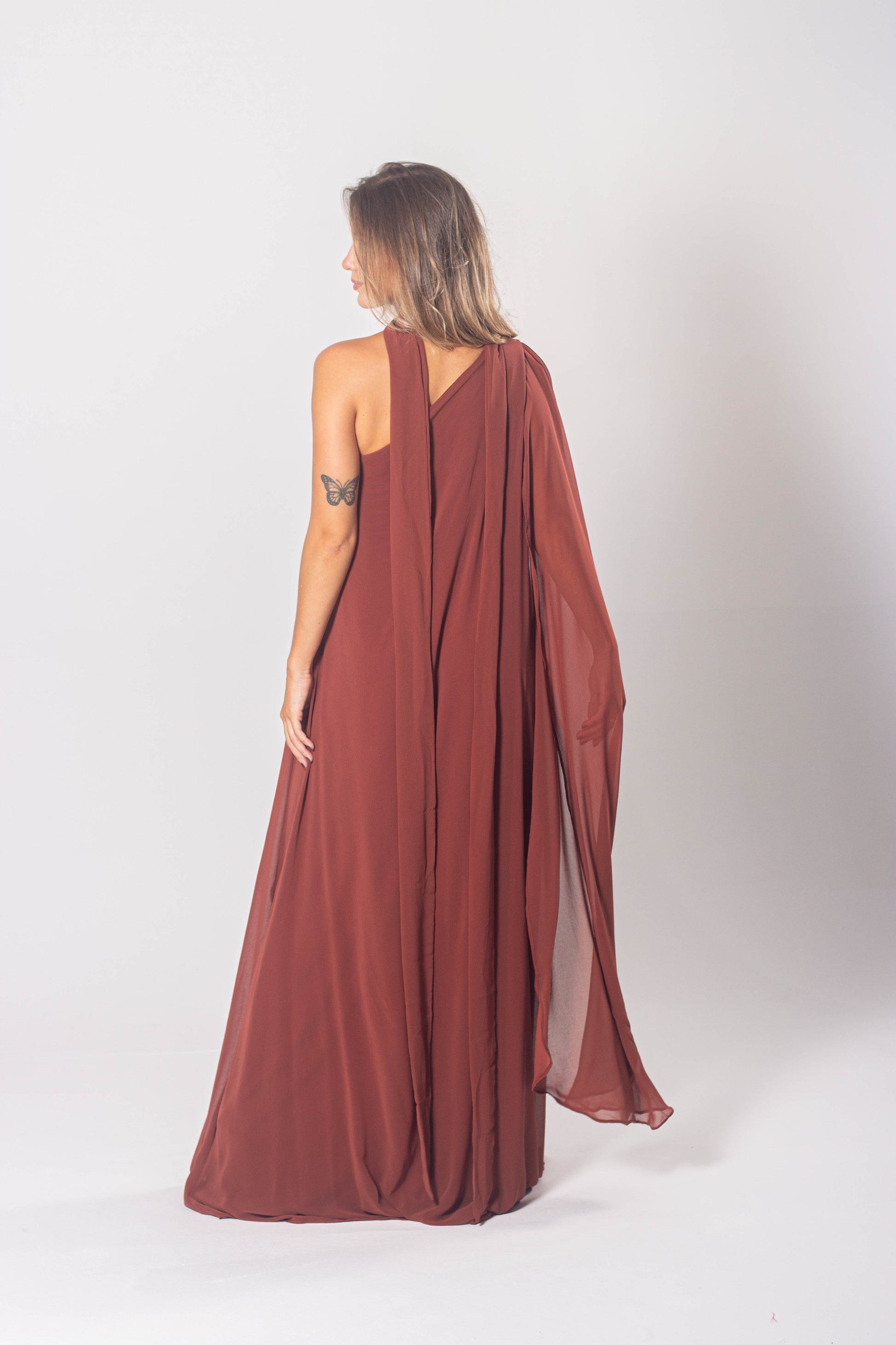 One-Shoulder Silk-Touch GGT Crepe Dress with Long Cape and Handcrafted Flower Sash.