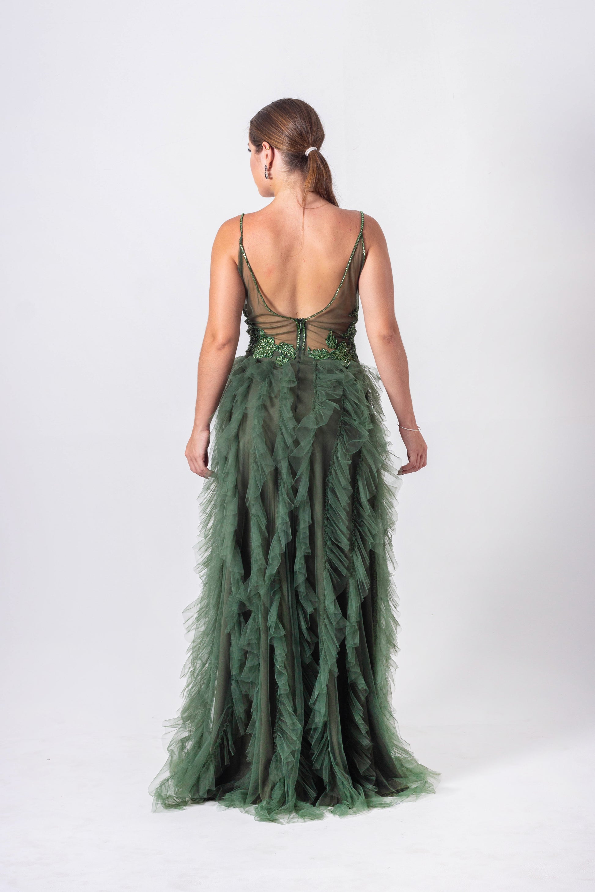 Tulle Dress with Spaghetti Straps, Hand-Embroidered Details, and Vertical Ruffled Skirt.