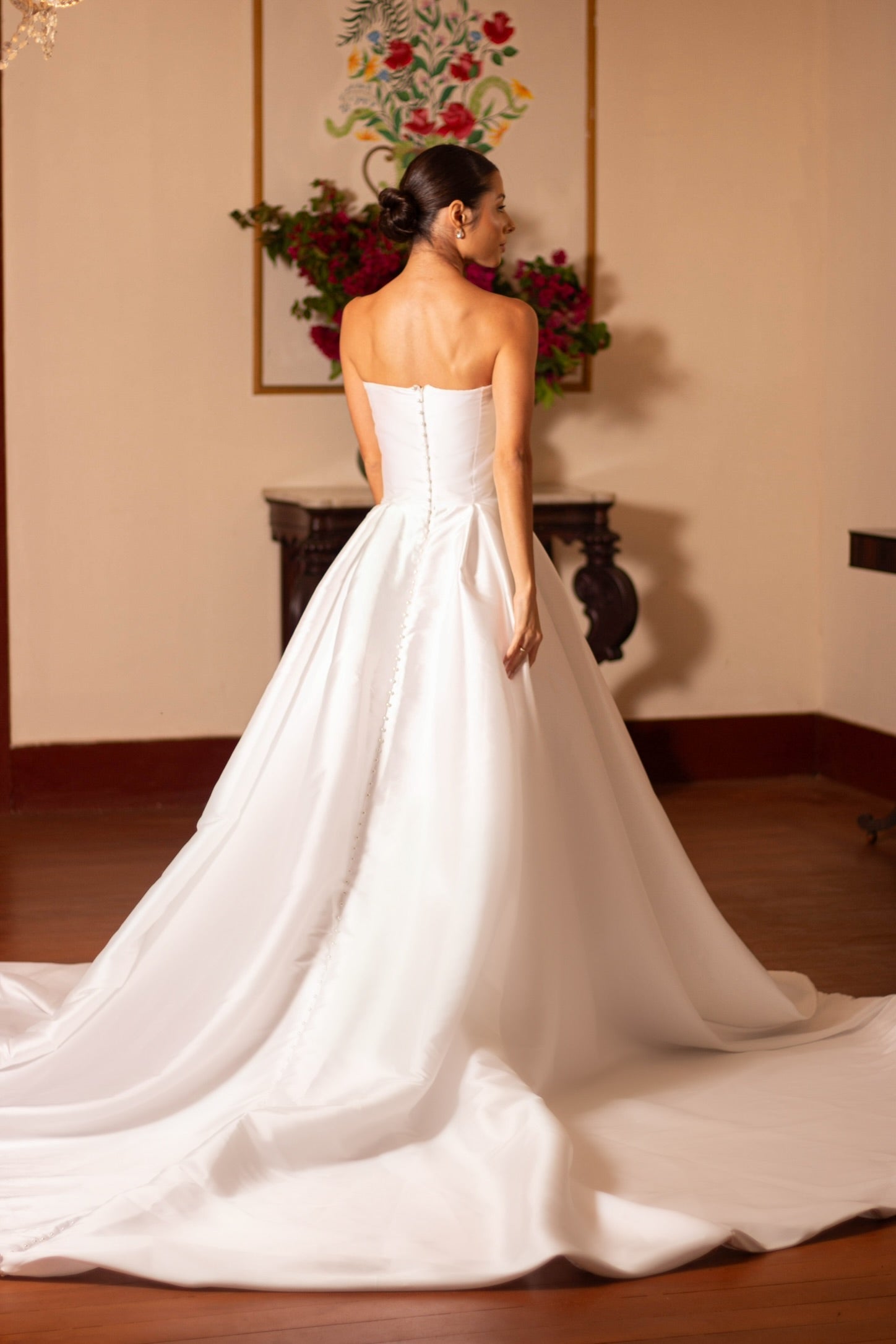 Wedding dress with draped bodice, long train, and pearl appliqués on the back.