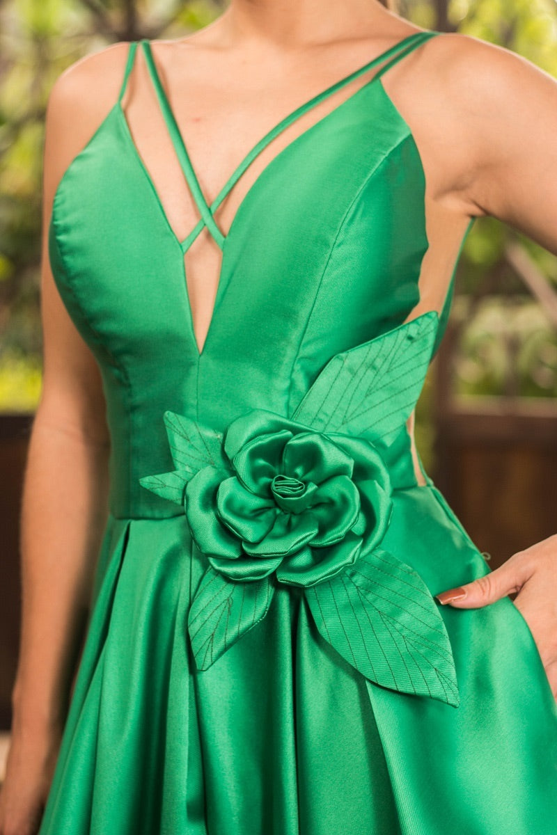 Zibeline Dress with Braided Strap and Handcrafted Flower Appliqué.