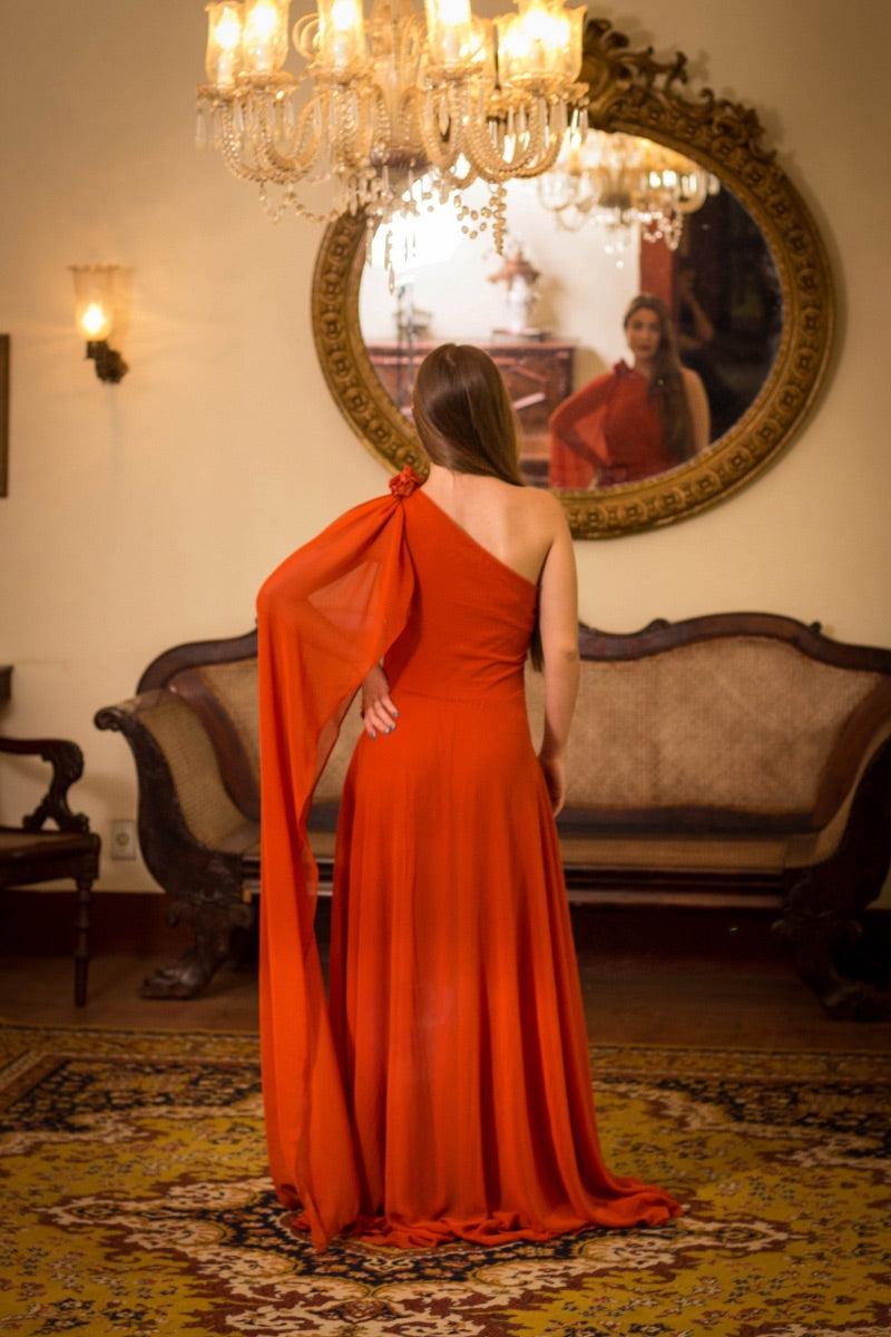 One-Shoulder Silk-Touch GGT Crepe Dress with Long Cape and Handcrafted Flower Appliqué.