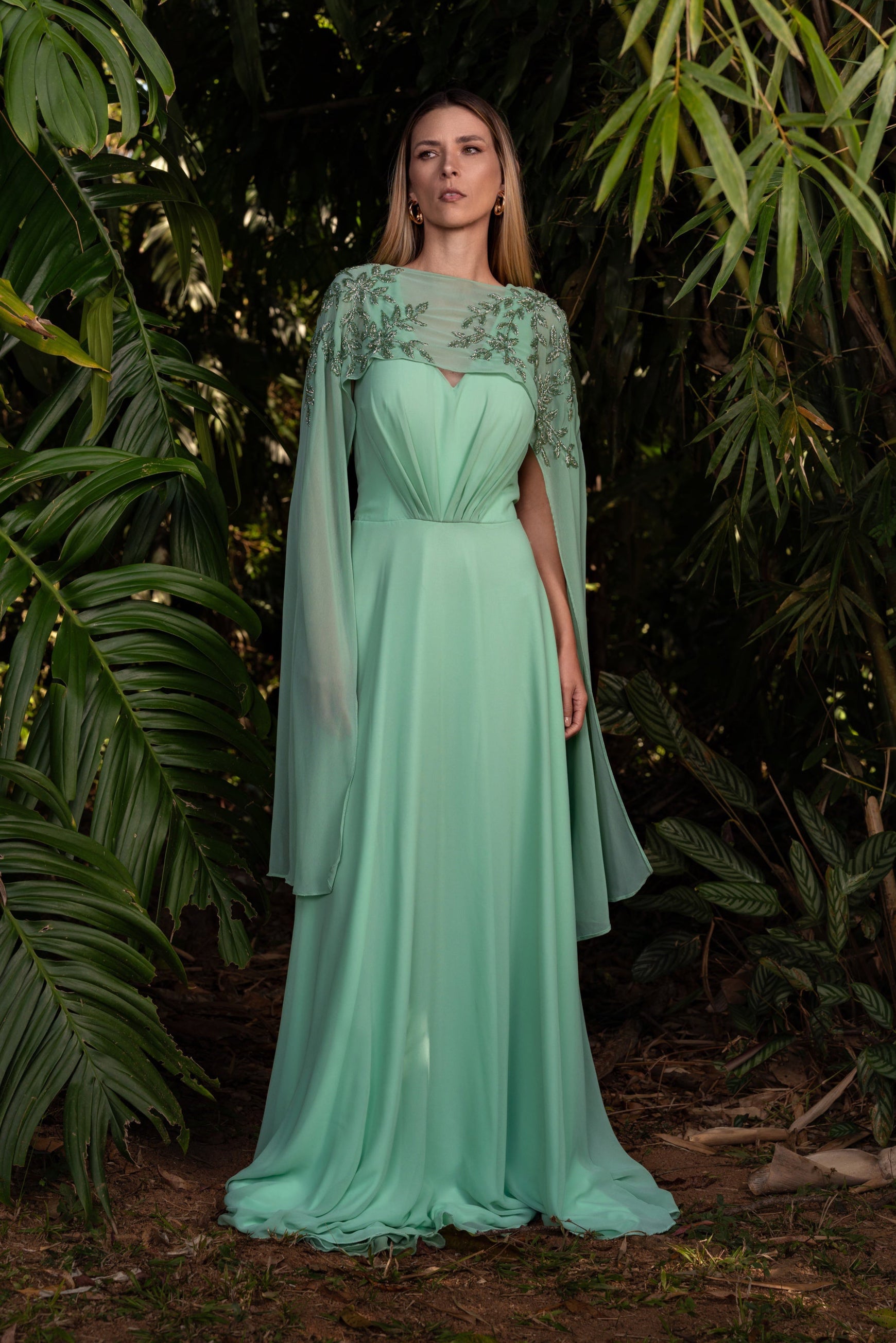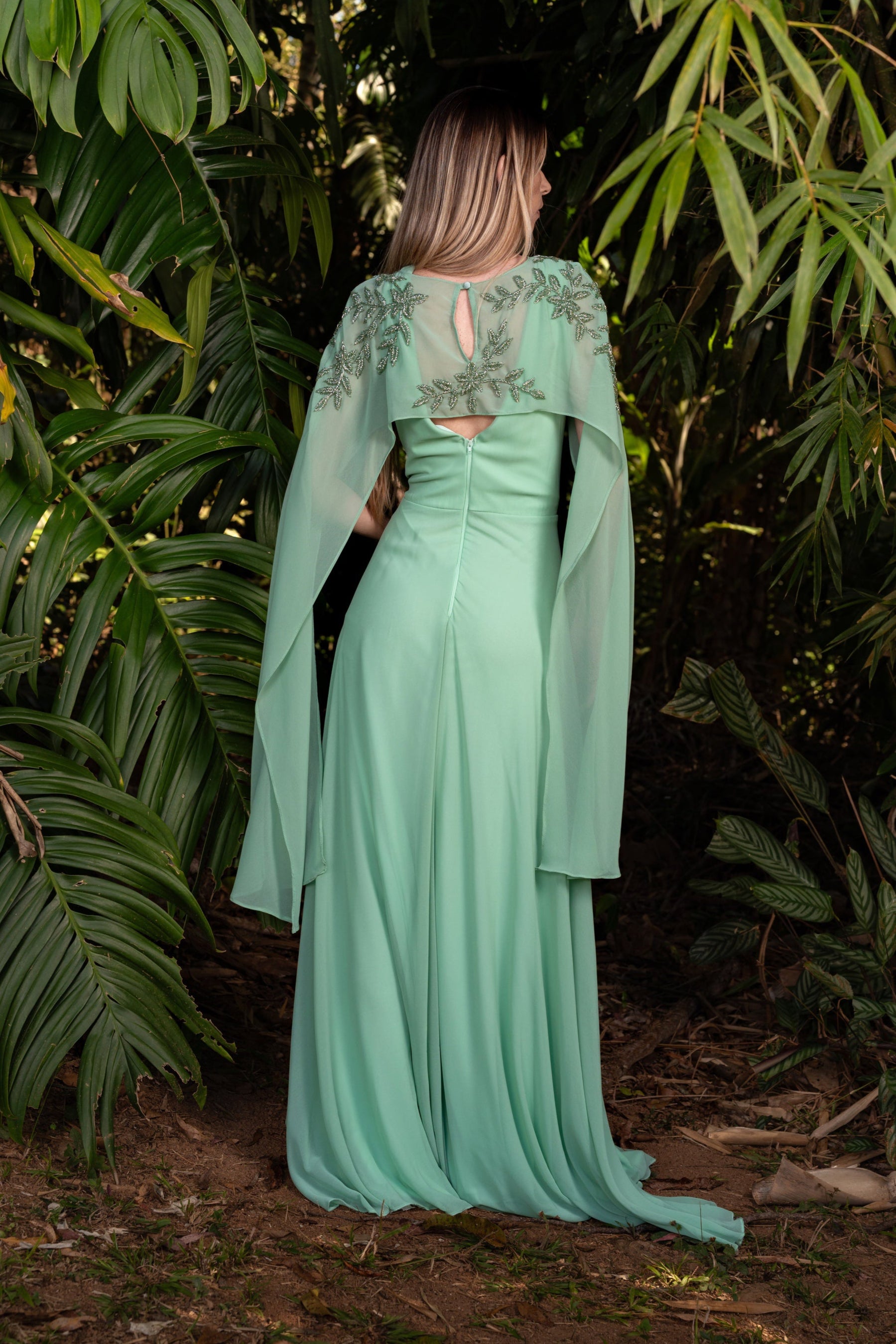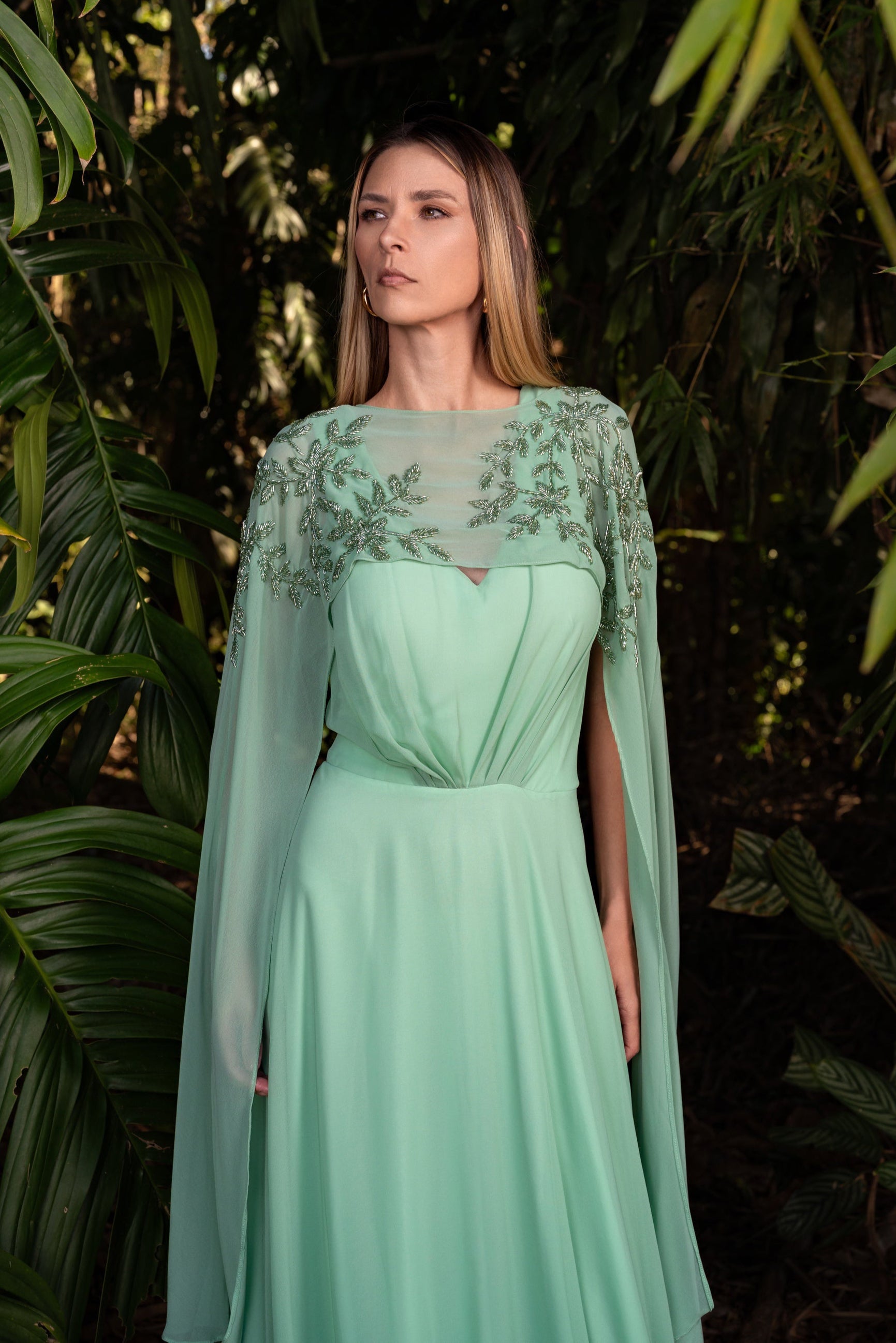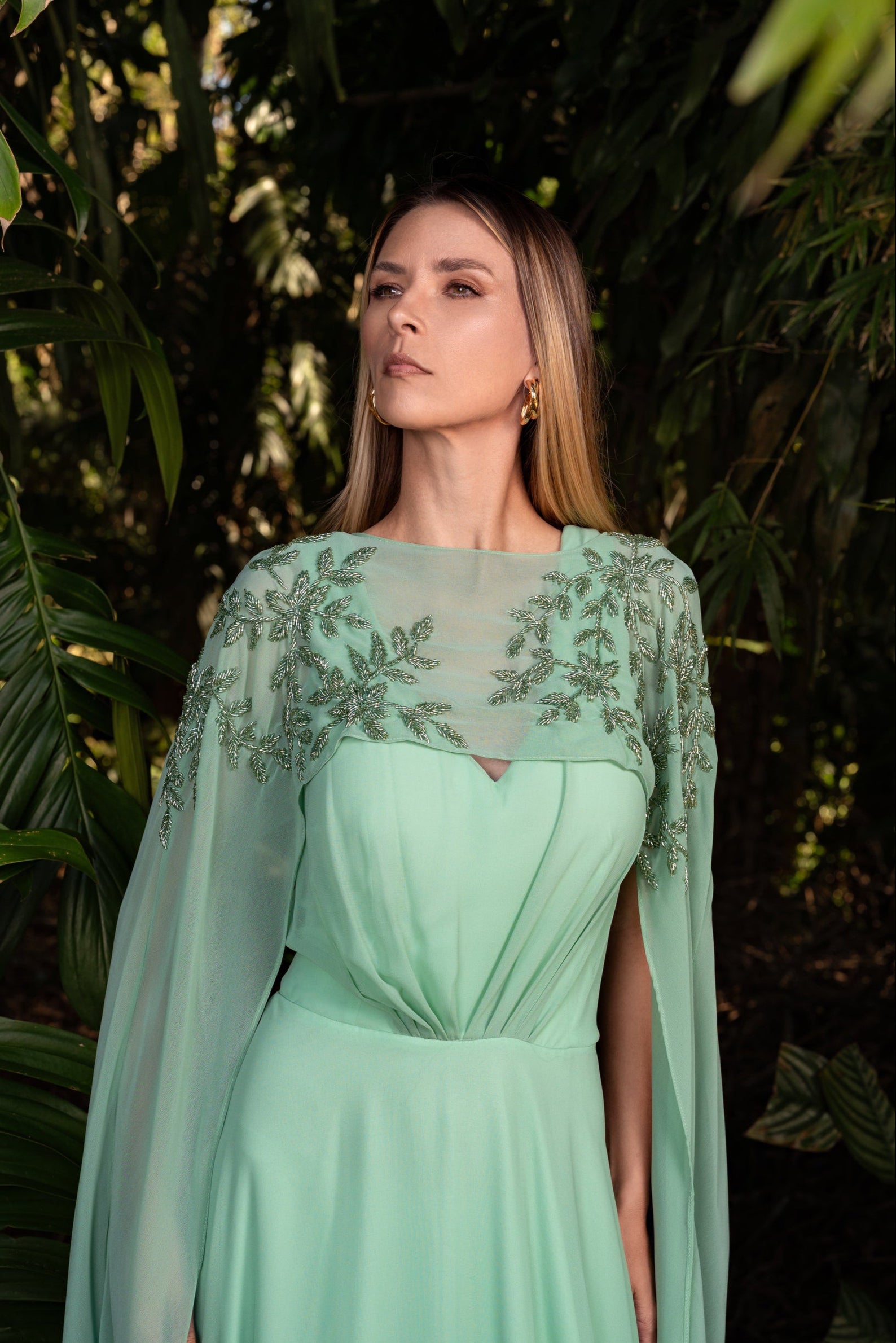 Crepe GGT Silk-Touch Dress with Removable Long Capes and Hand-Embroidered Details.