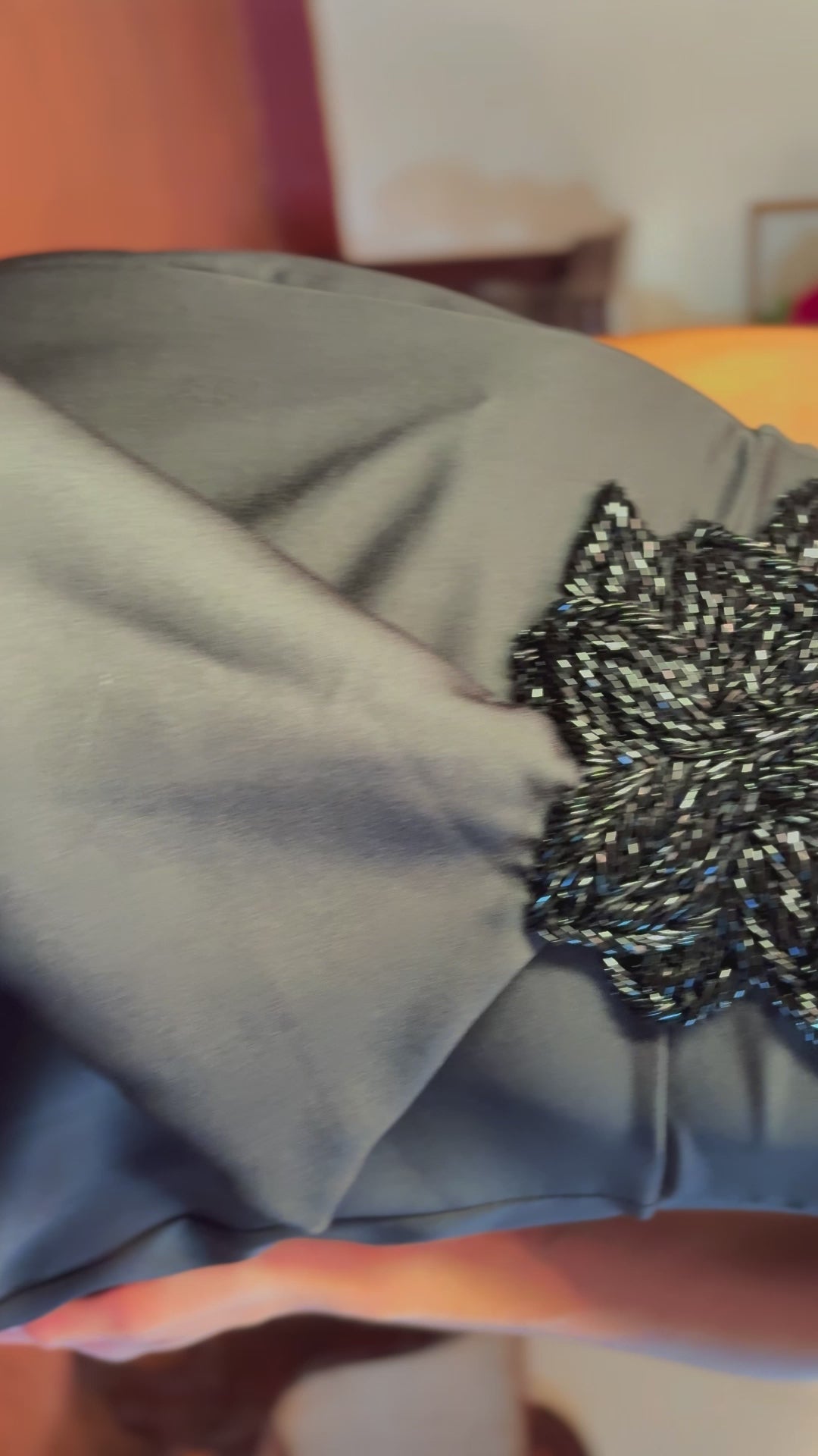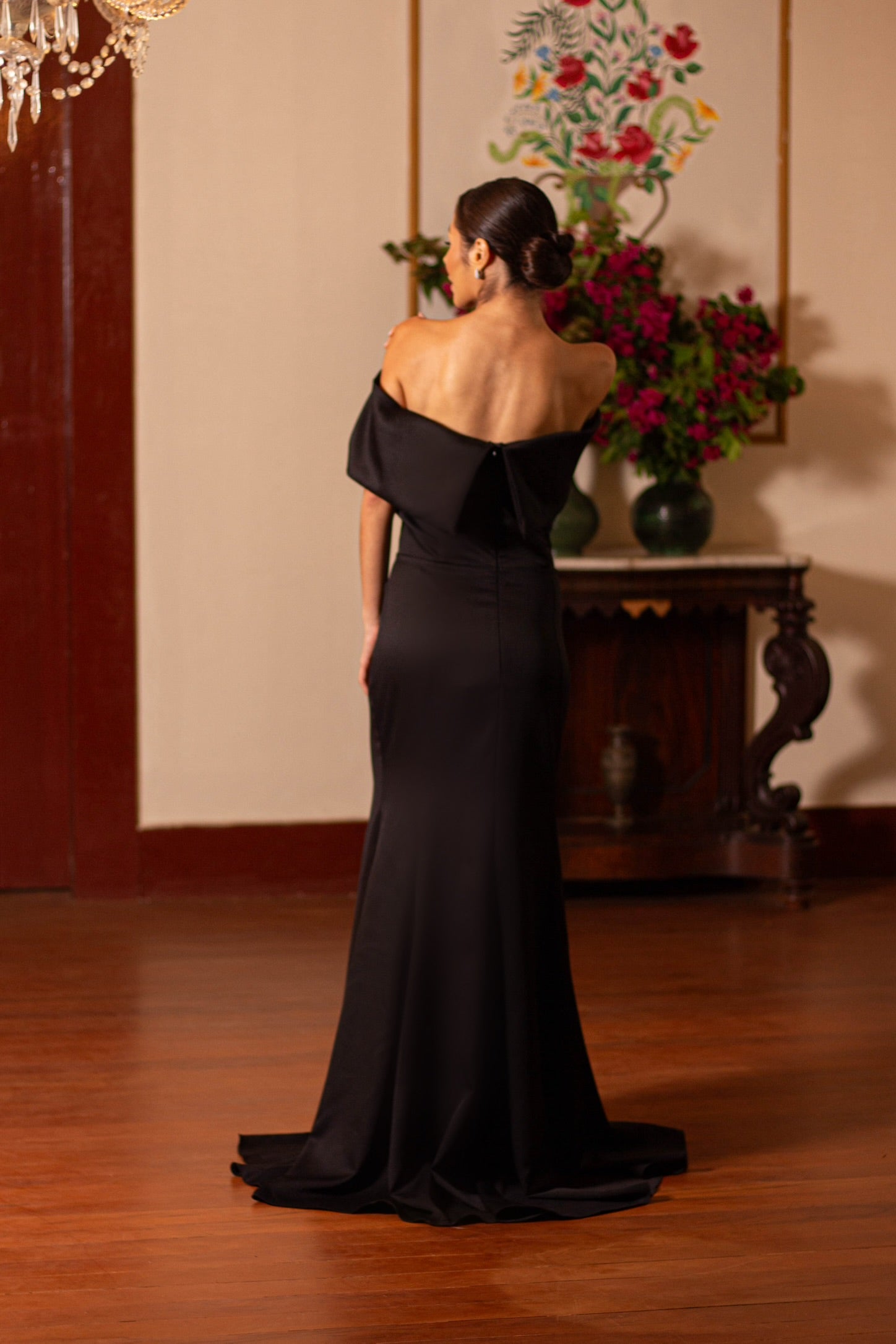 Tailoring Dress (Crepe Miu Miu) Off-Shoulder with Bow, Mermaid Silhouette, and Handcrafted Embroidery.