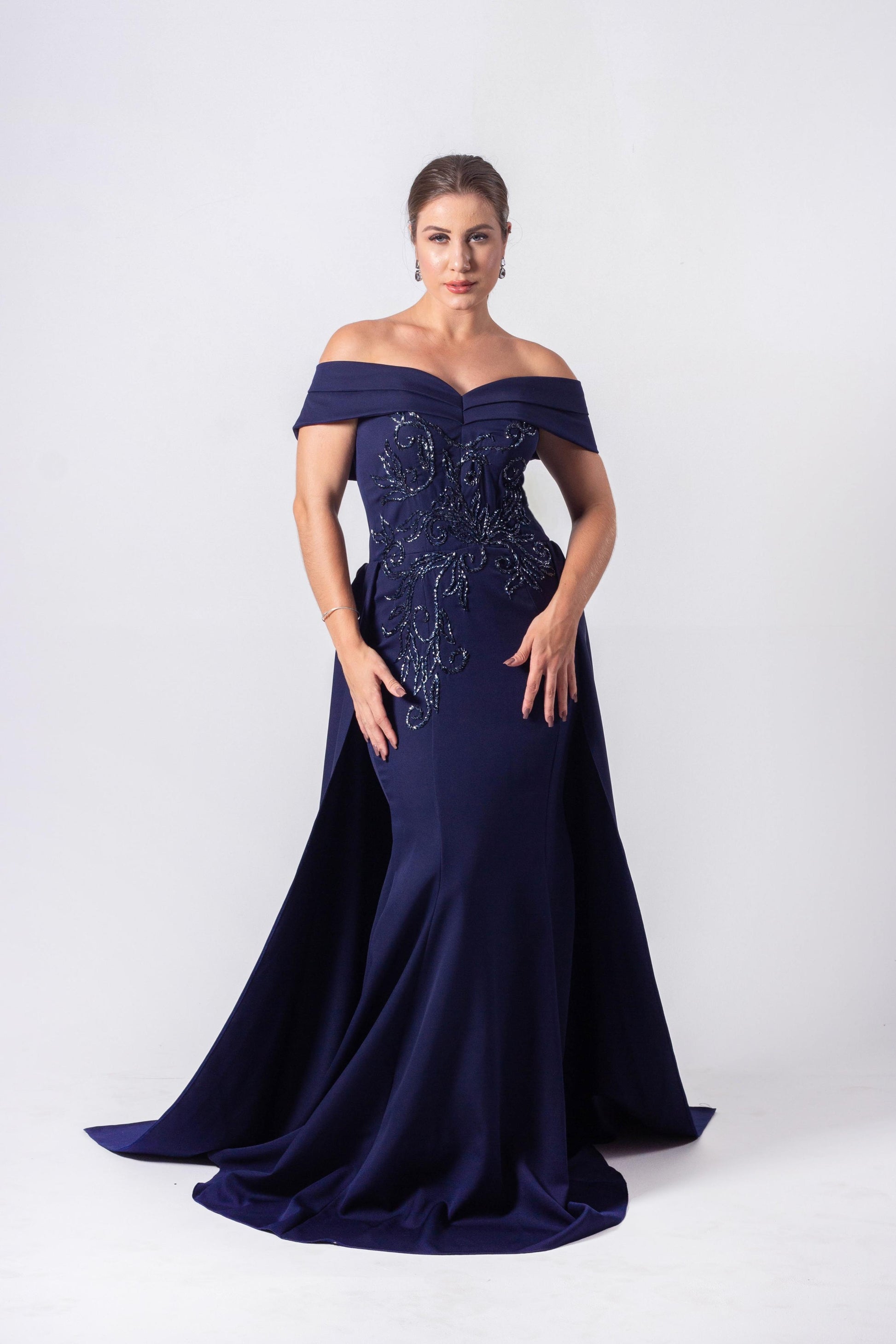Off-Shoulder Crepe Miu Miu Tailored Dress with Back Cape, Mermaid Silhouette, and Handcrafted Embroidery.