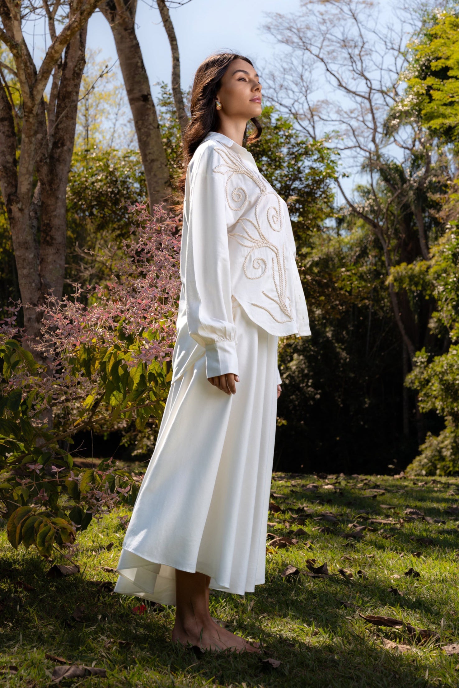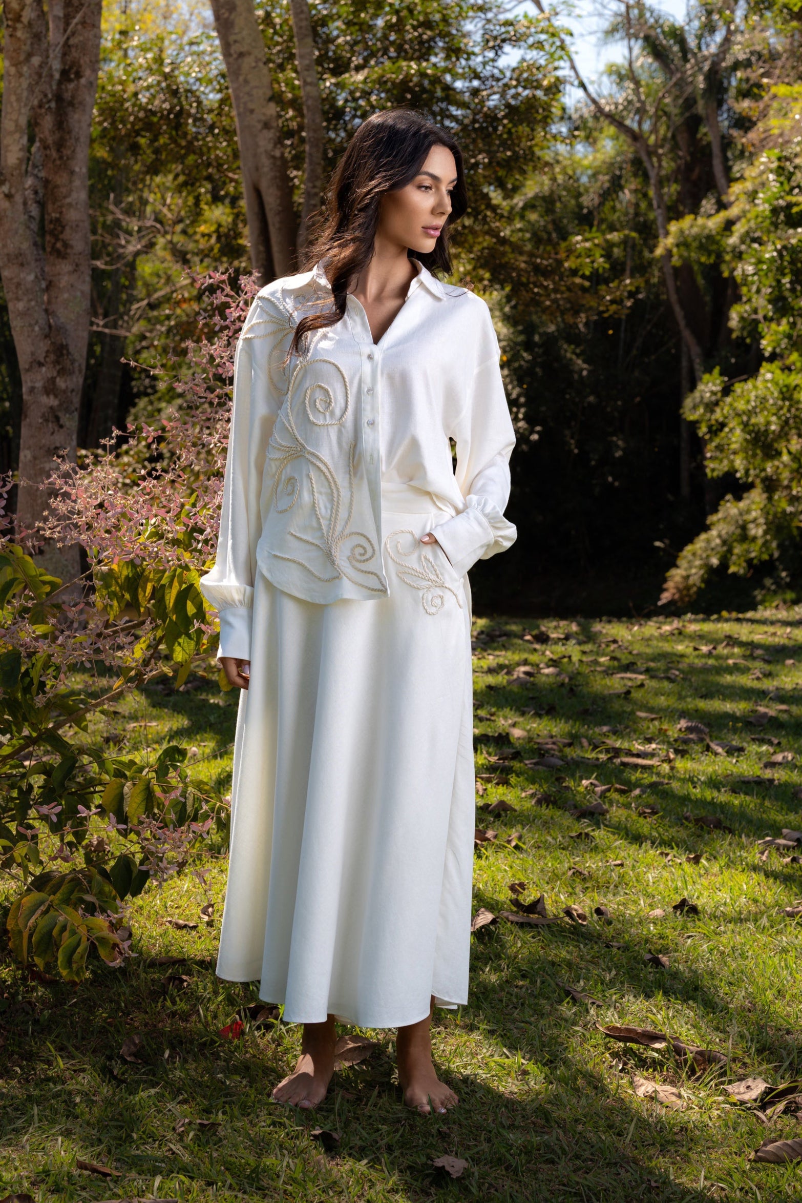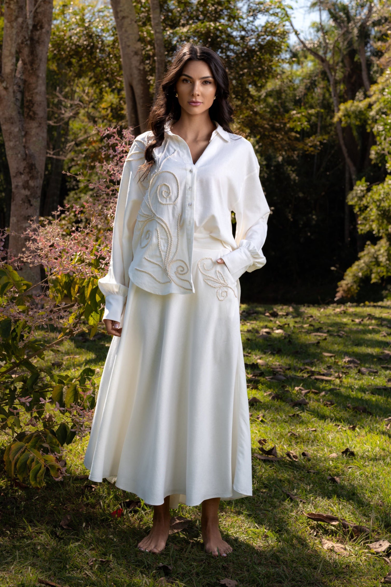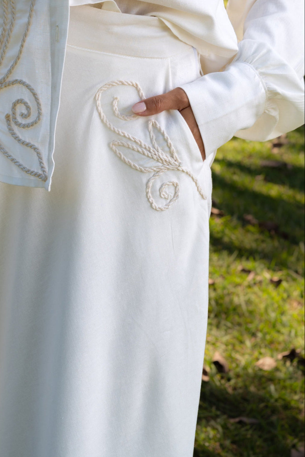 Chic and functional, this linen skirt is adorned with hand-embroidered rope details that add artisanal texture and charm. Featuring practical pockets and a flattering fit, it combines elegance with everyday versatility. Perfect for summer outings, casual events, or coordinated looks with linen tops and blazers.