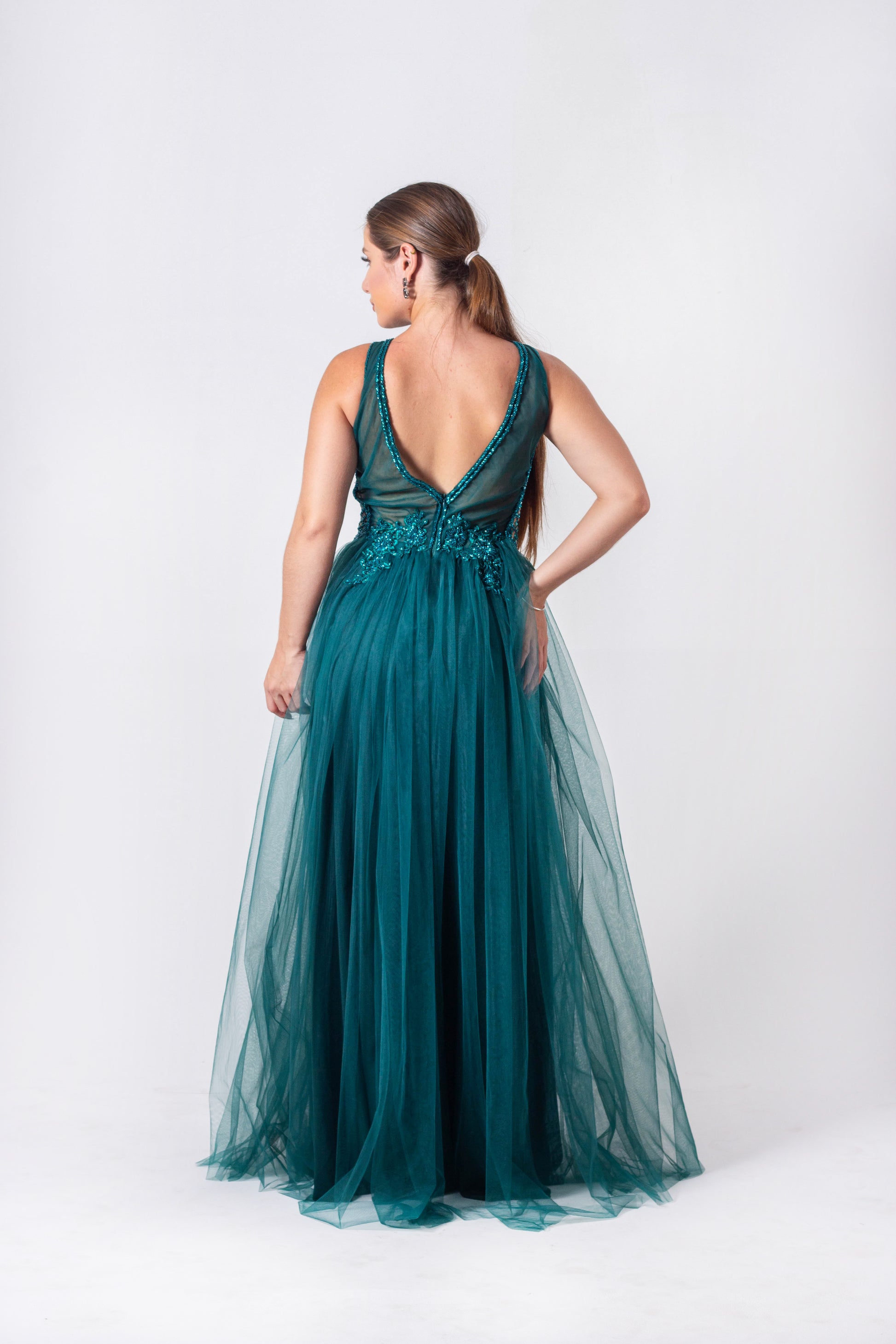 Tulle Dress with Hand-Embroidered Details, Wide Straps, and Deep Neckline.