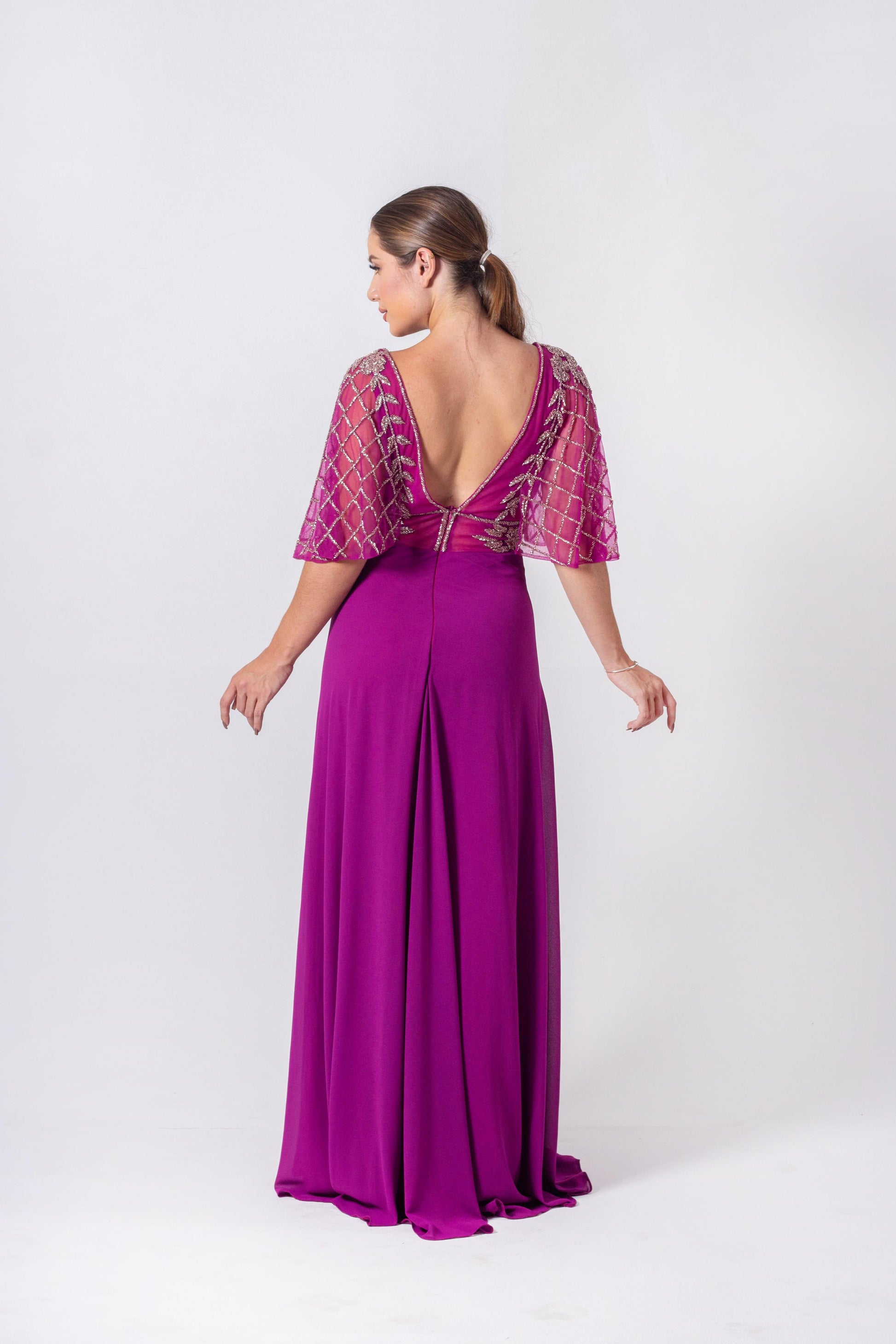Silk-Touch GGT Crepe Dress with Illusion Tulle Capes and Hand-Embroidered Details.
