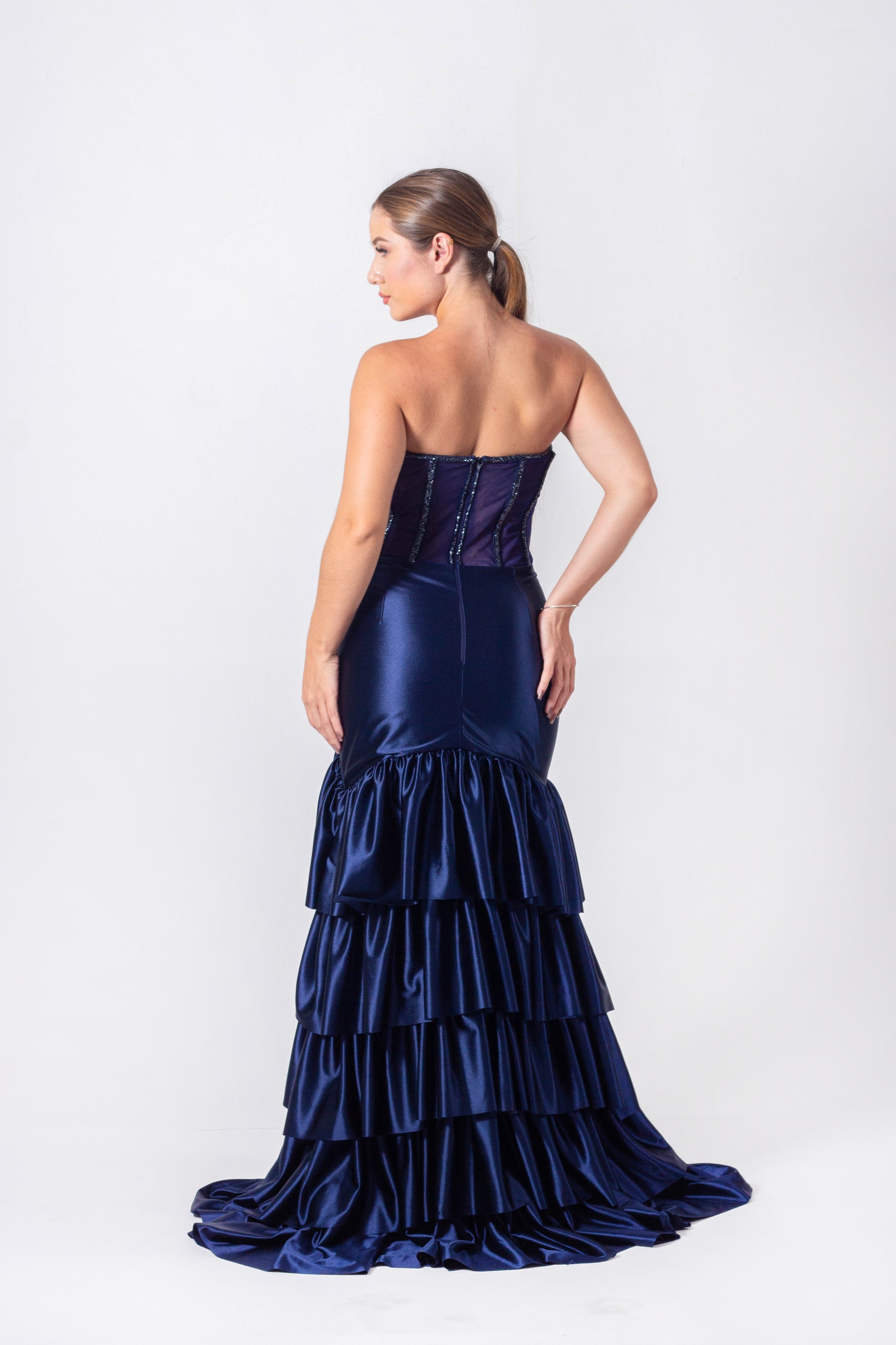 Satin Dress with Corset Bodice, Hand-Embroidered Details, Ruffled Skirt, and a Slit.