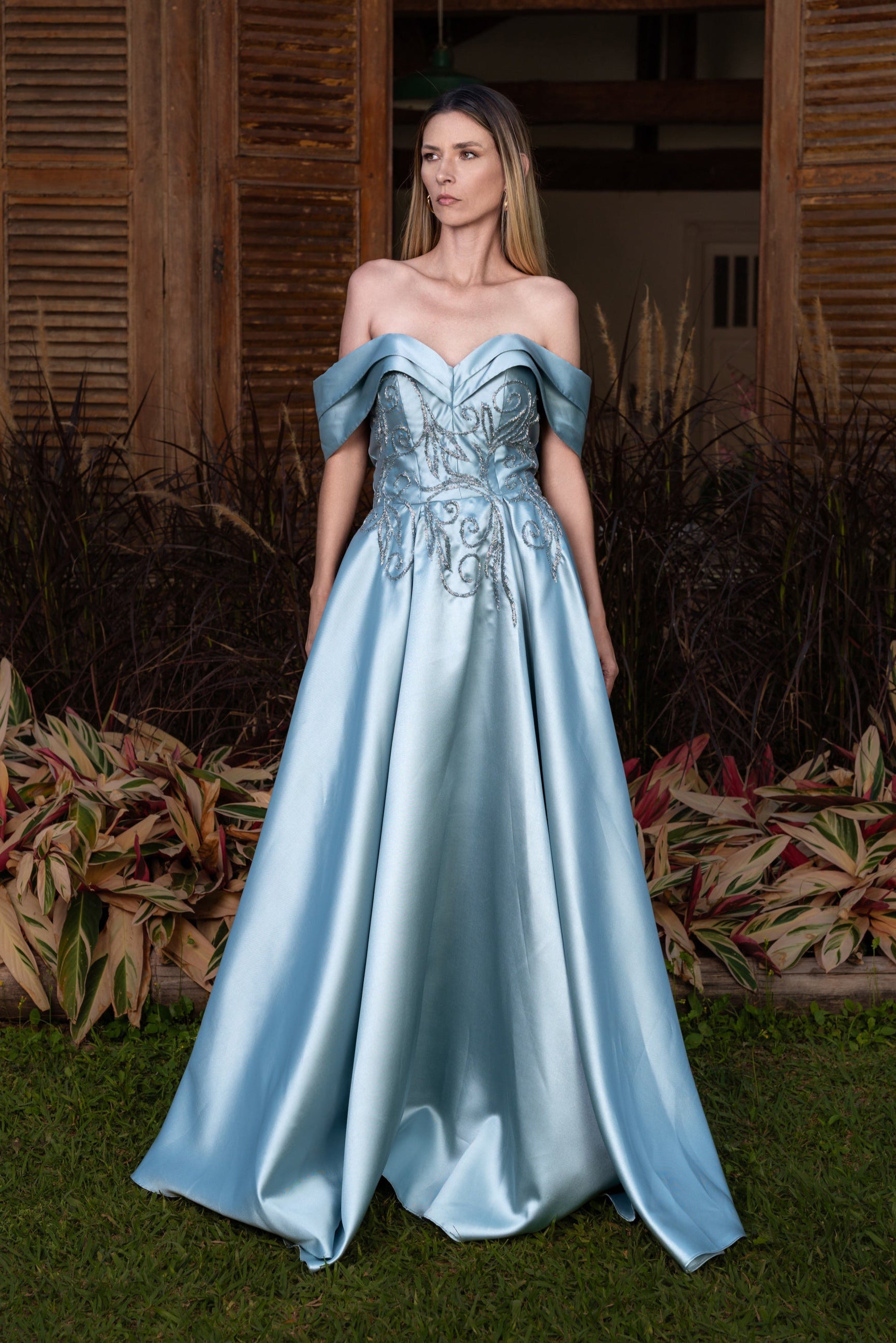 Off-Shoulder Zibeline Dress with Hand-Embroidered Details.