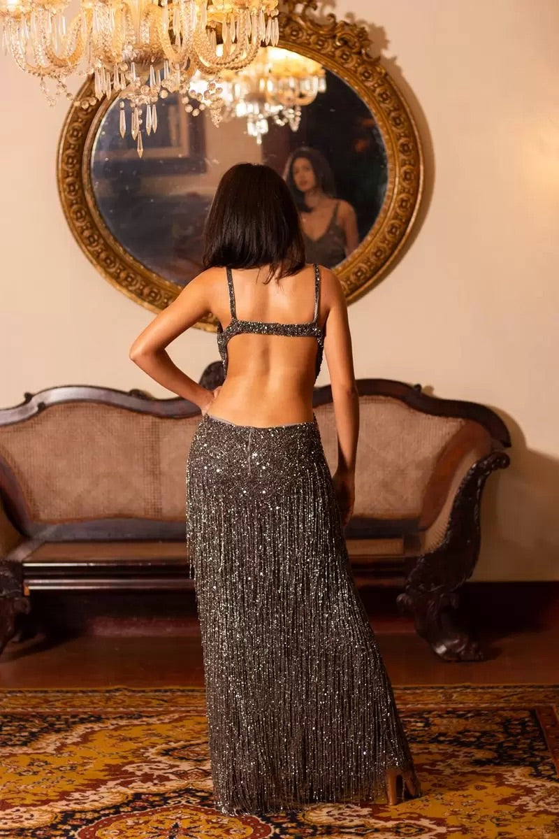Fully Hand-Embroidered Dress with Fringe, Mermaid Skirt, and Slit.