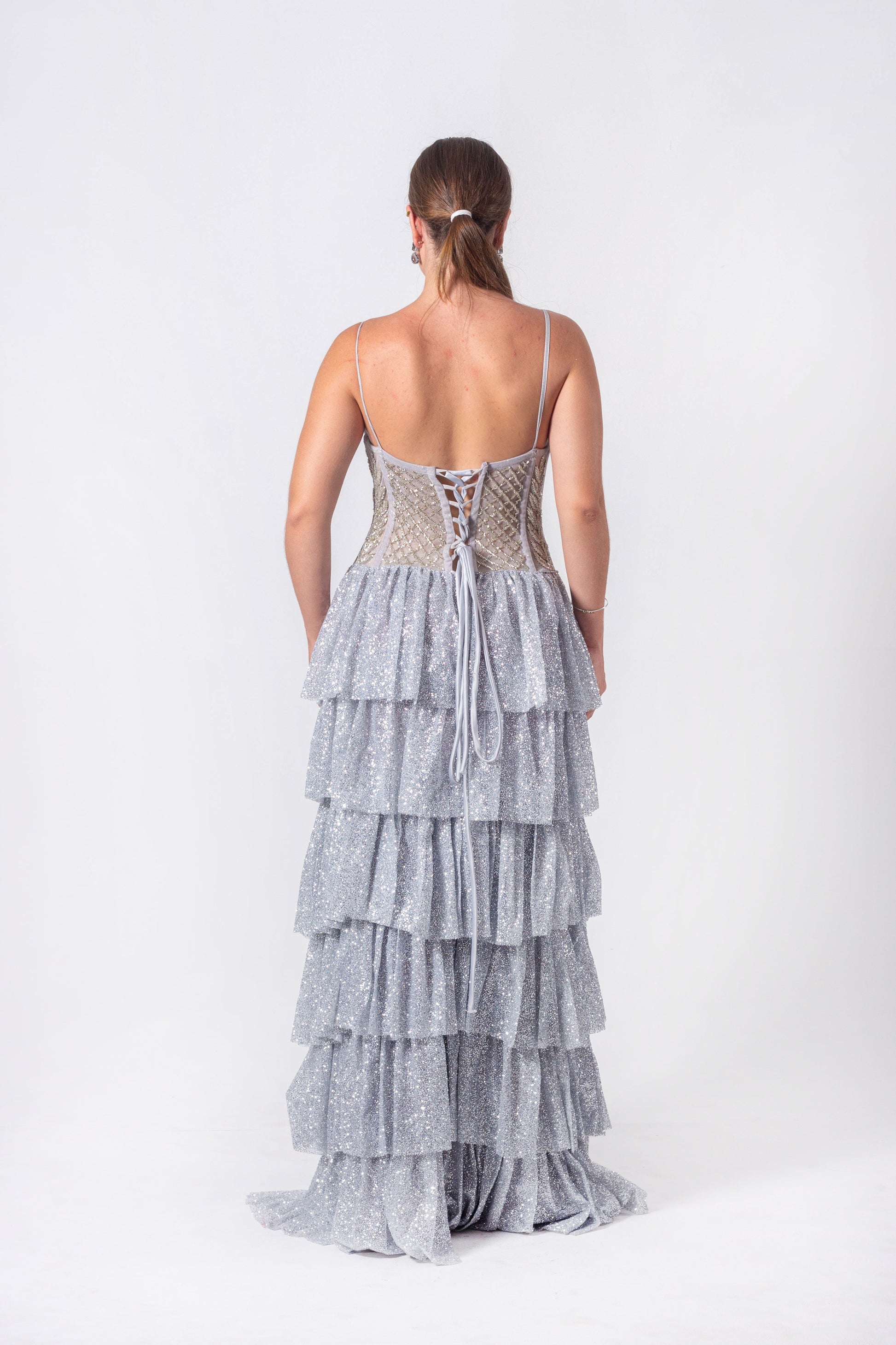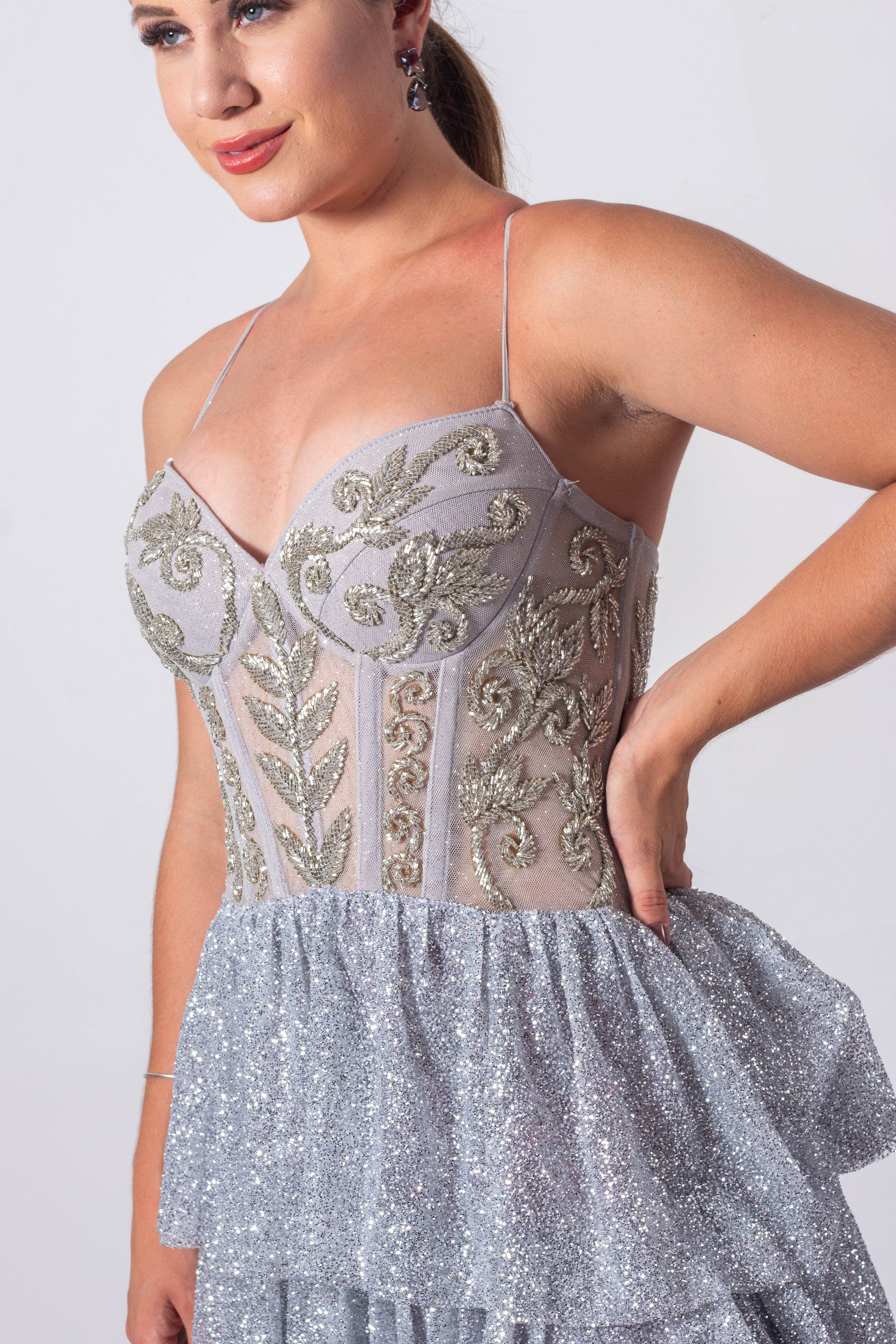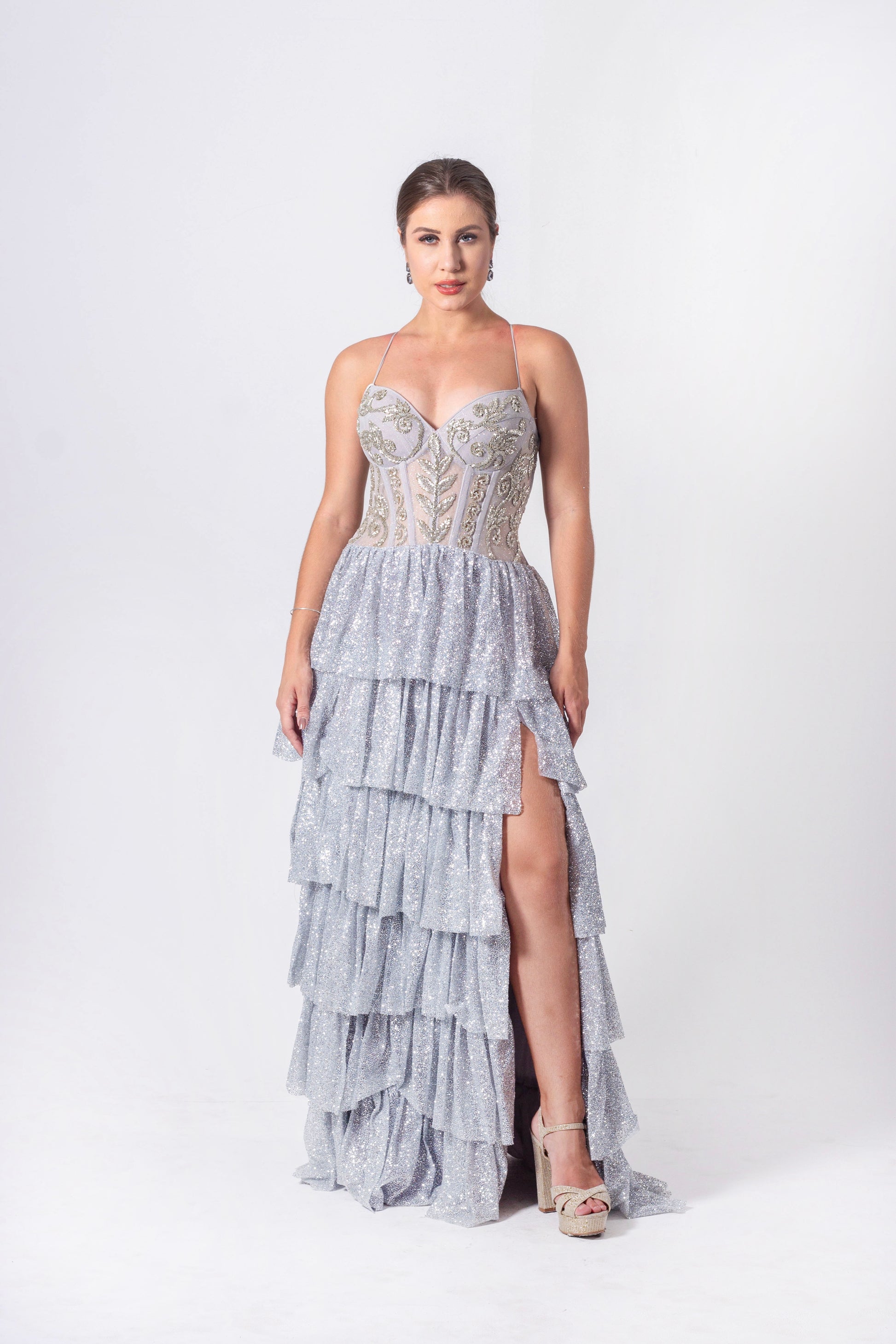 Glitter Dress with Hand-Embroidered Corset Bodice, Ruffled Skirt, and a Slit.