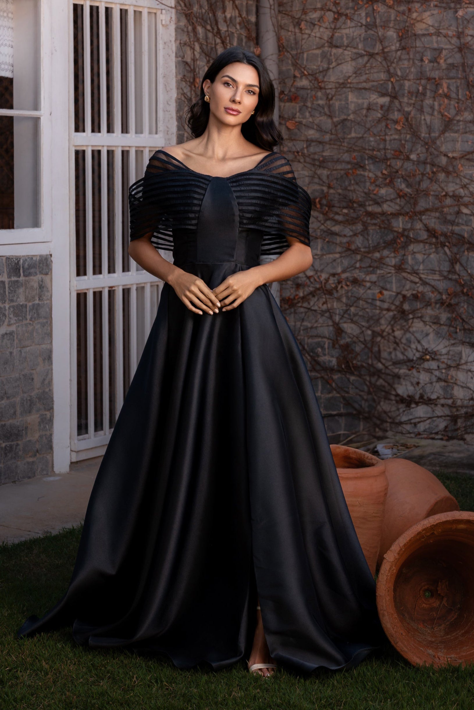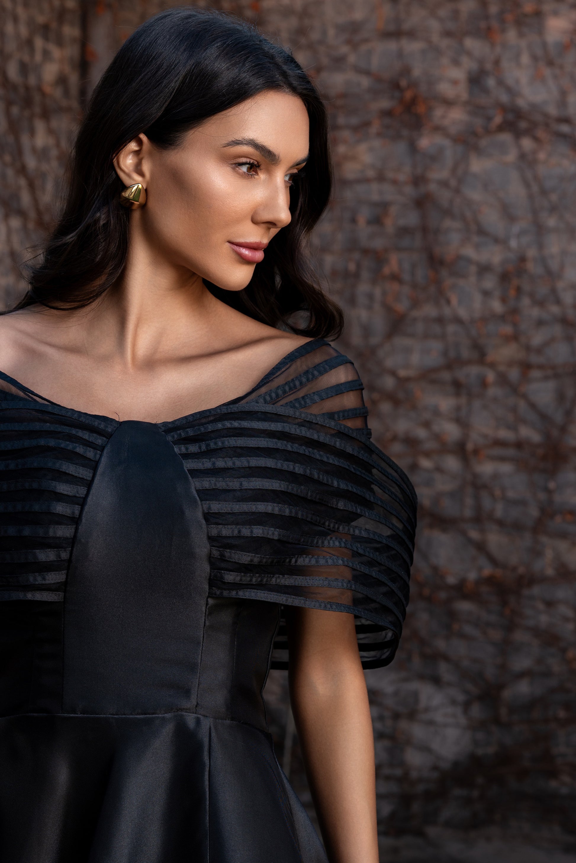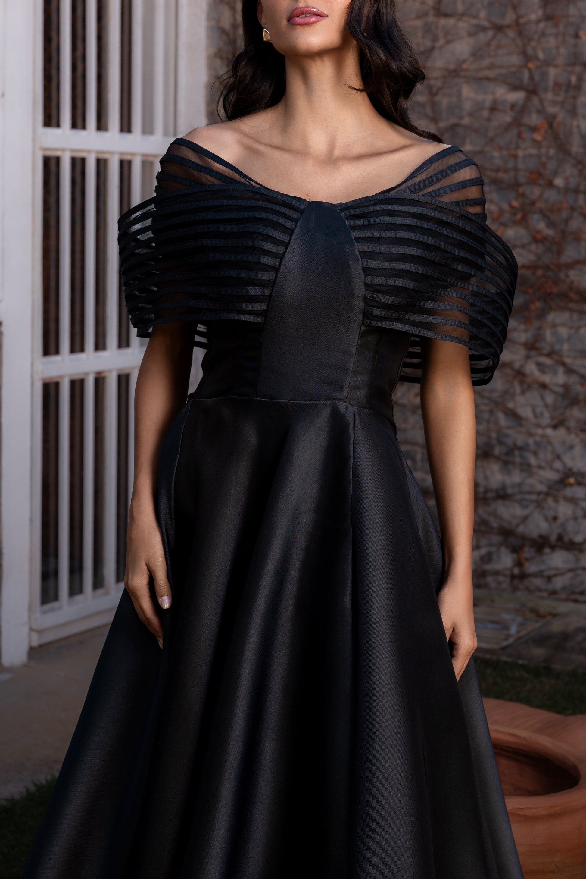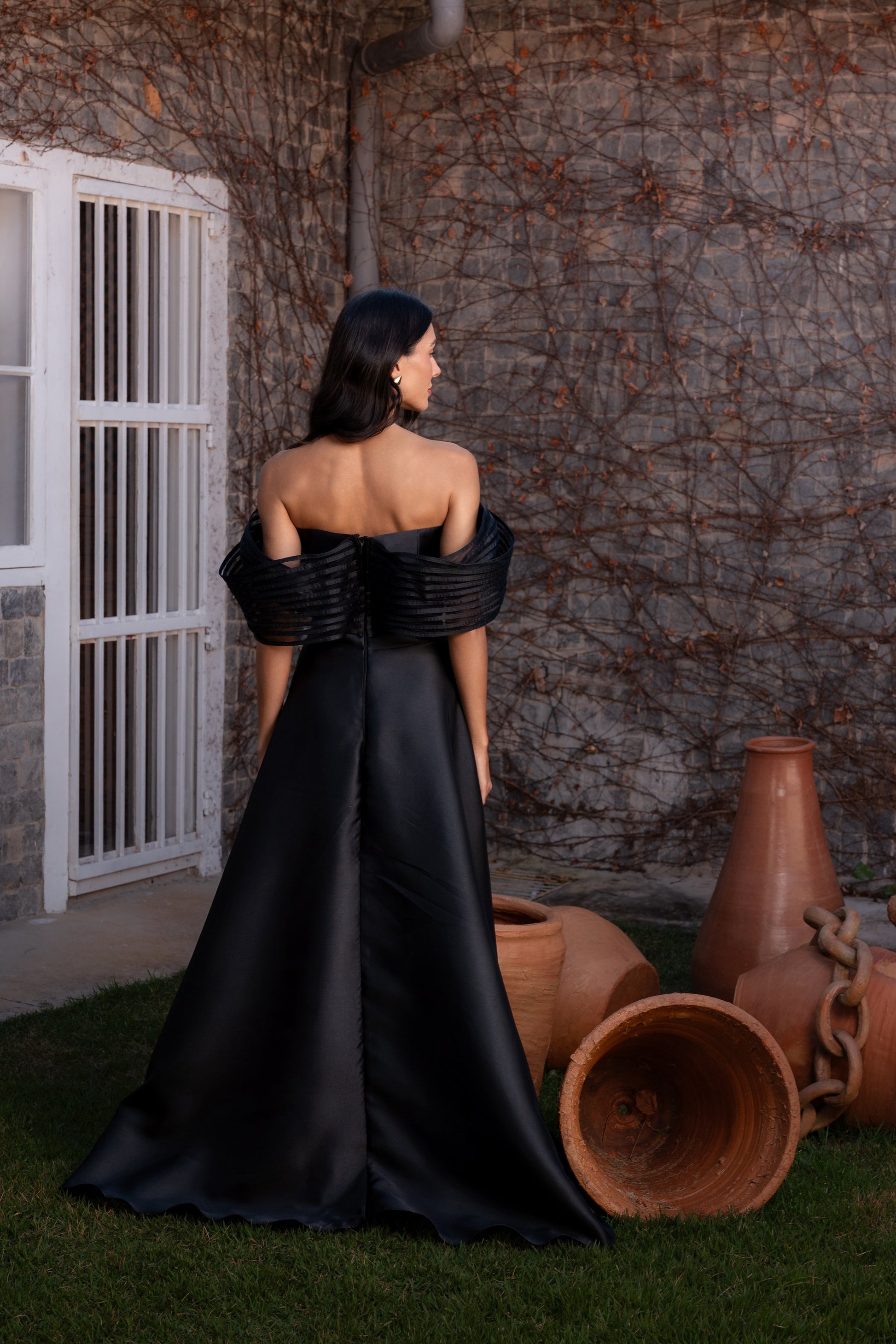 Off-Shoulder Zibeline Dress with Bias-Cut Applications.