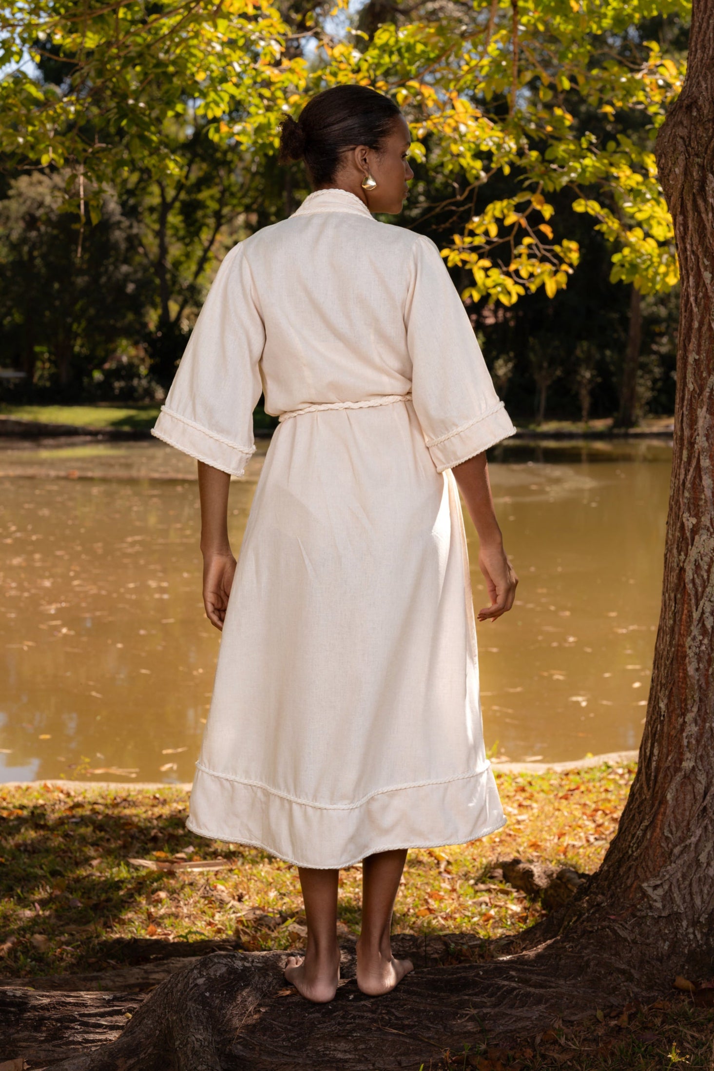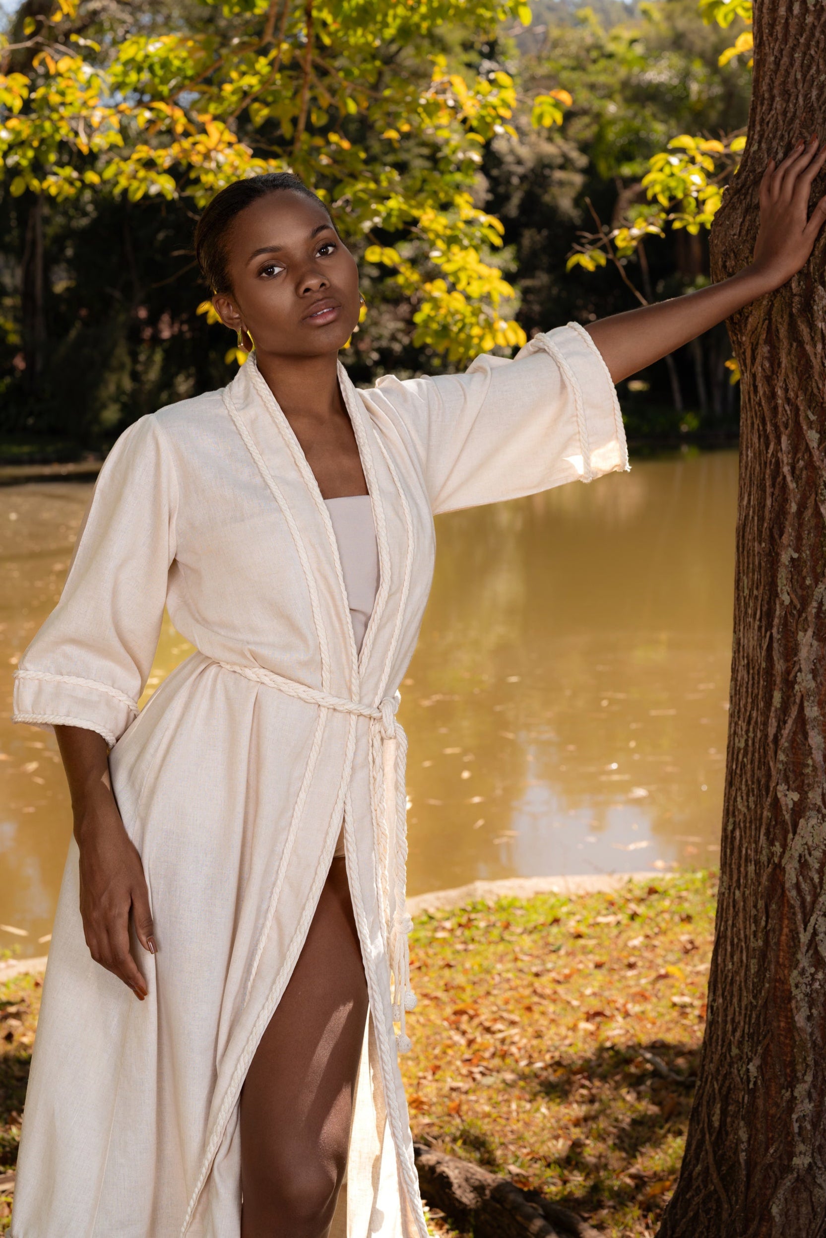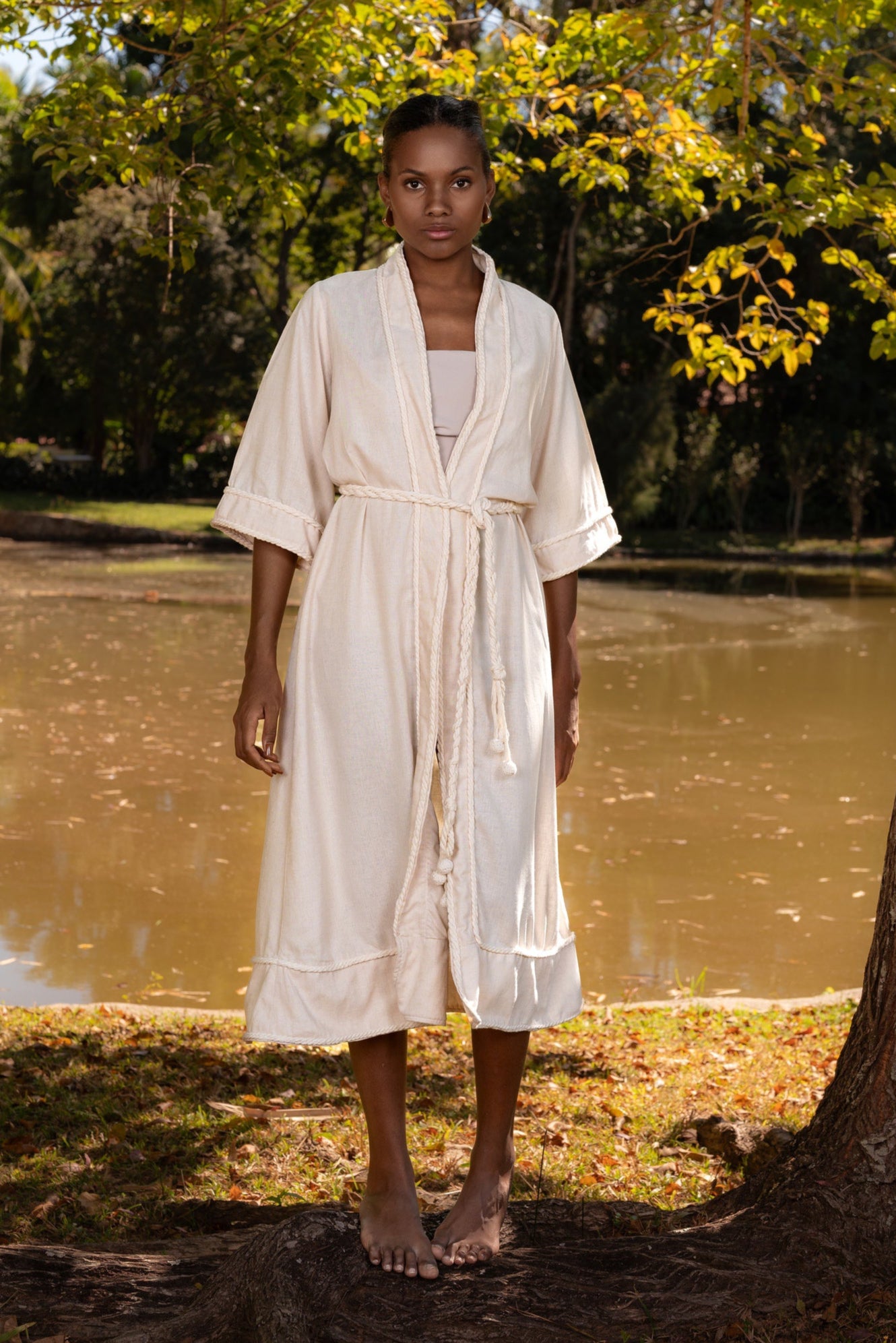 Relaxed and refined, this linen robe is styled with a rope belt that adds artisanal charm and definition to the silhouette. Lightweight and versatile, it can be worn as a cover-up, layered over summer outfits, or styled as an elegant lounge piece. Perfect for vacations, beachside moments, or relaxed evenings.