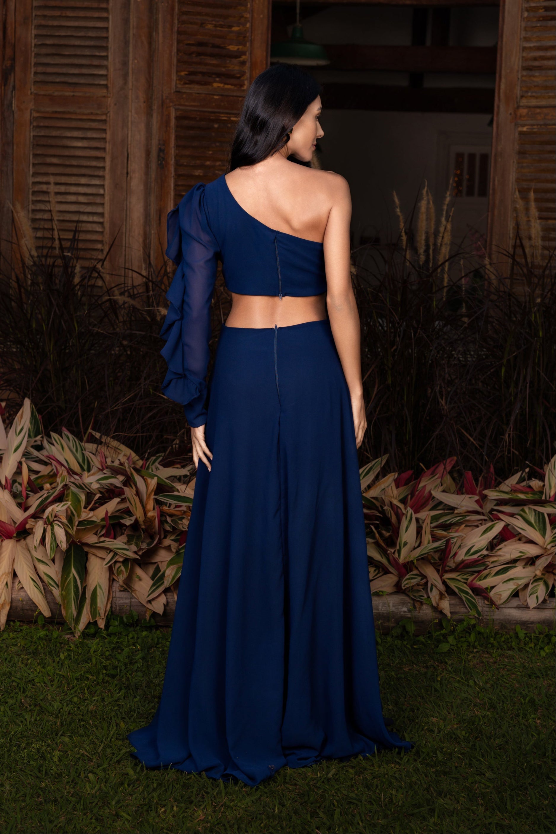One-Shoulder Crepe GGT Silk-Touch Dress with Long Sleeve and Handcrafted Flower.