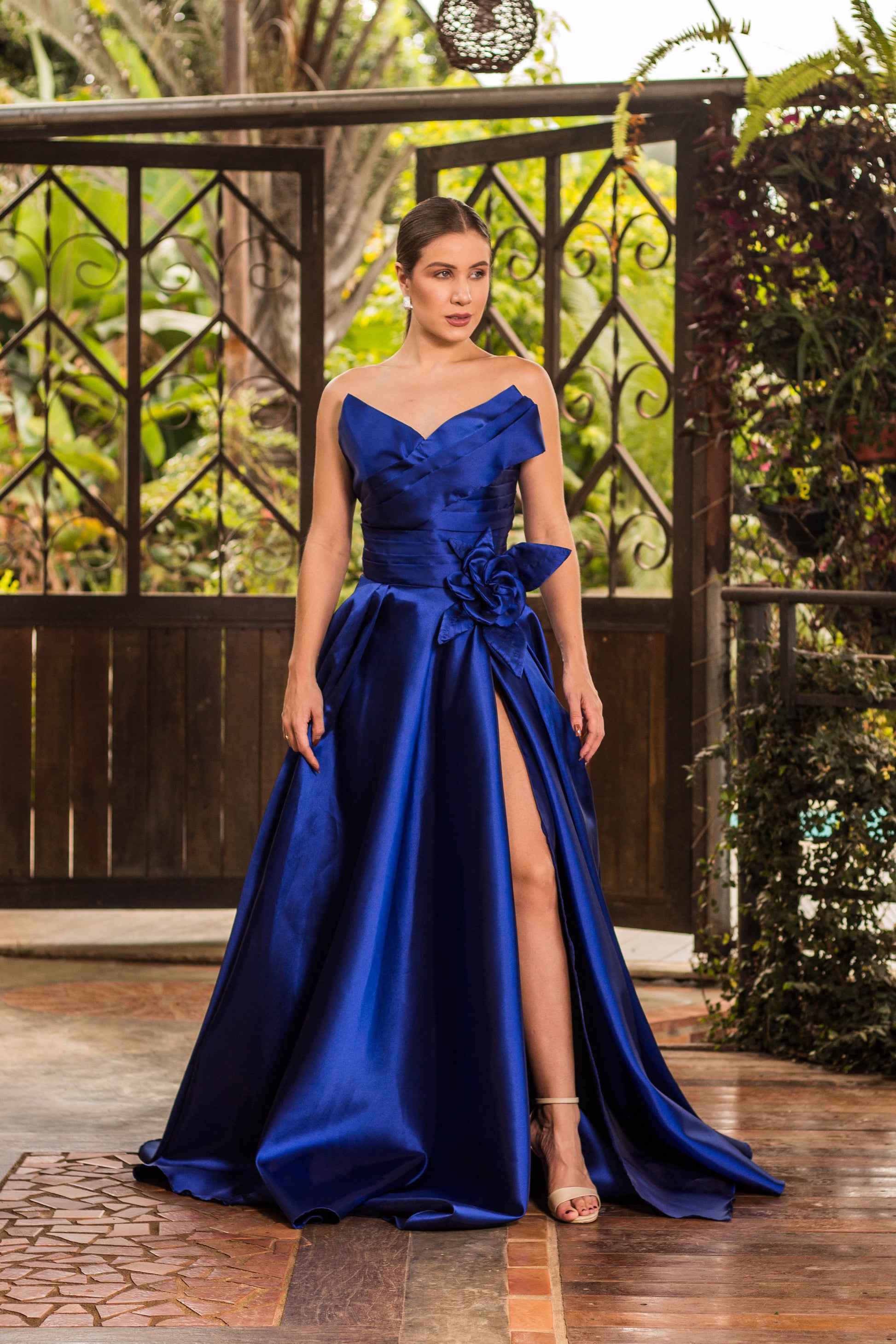 Zibeline Dress with Draped Corset, Handcrafted Flower Appliqué, and a Slit.