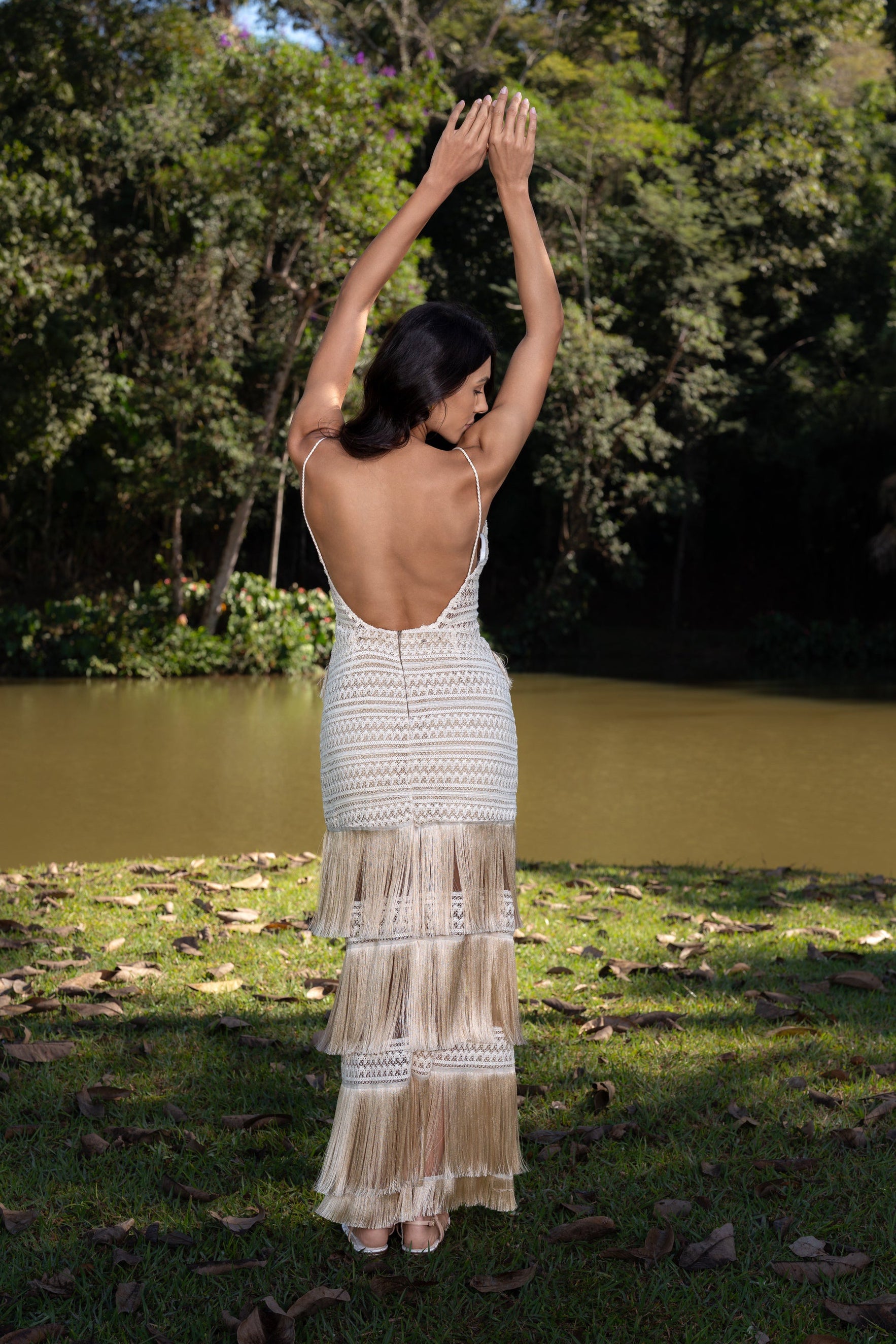 Bohemian and sophisticated, this maxi dress is beautifully crafted in crochet and finished with cascading fringe for striking texture and movement. Designed with a flattering silhouette and floor-length elegance, it brings effortless allure to summer soirées, beachside events, or festive getaways.