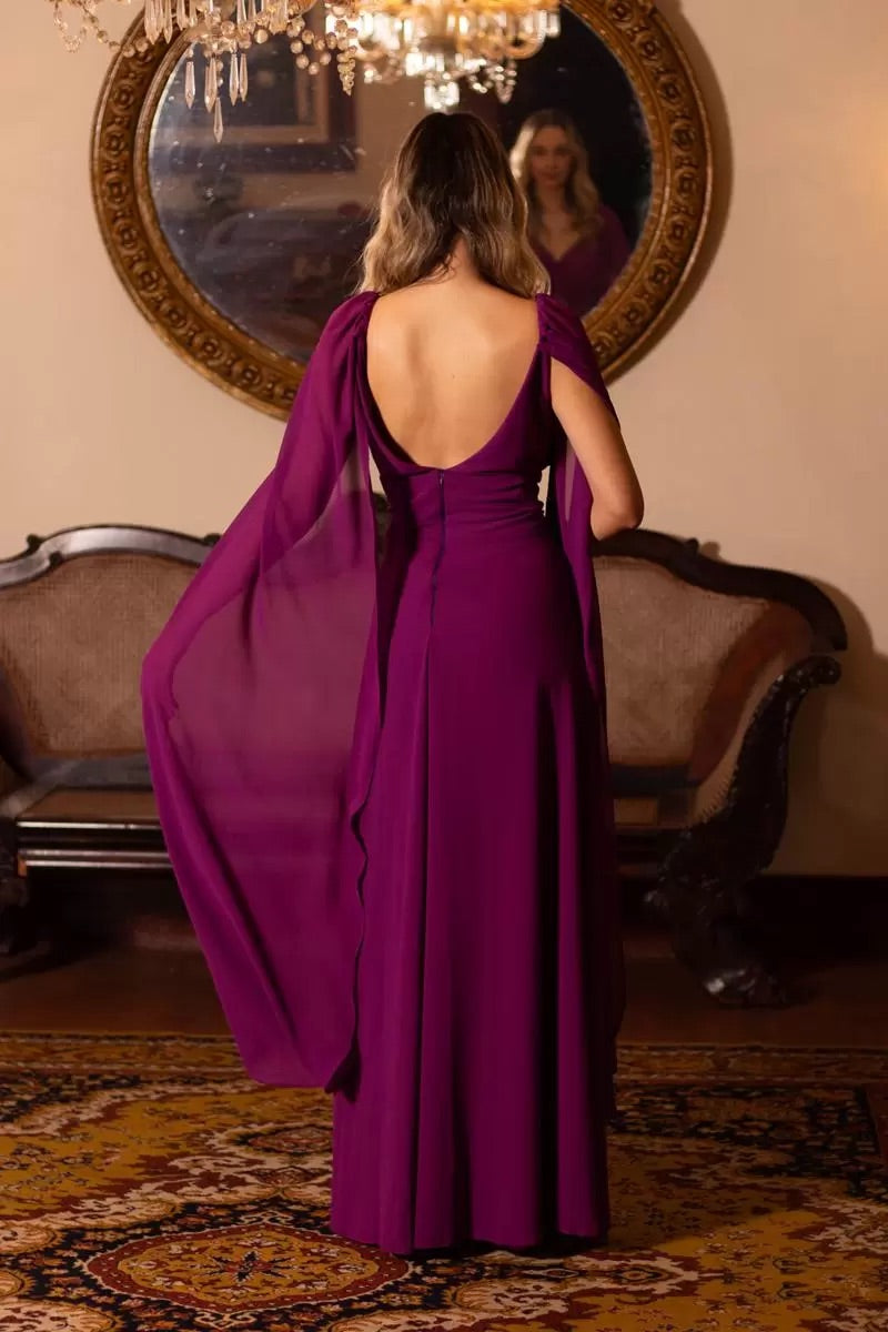 Silk-Touch GGT Crepe Dress with Long Capes and Hand-Embroidered Details.