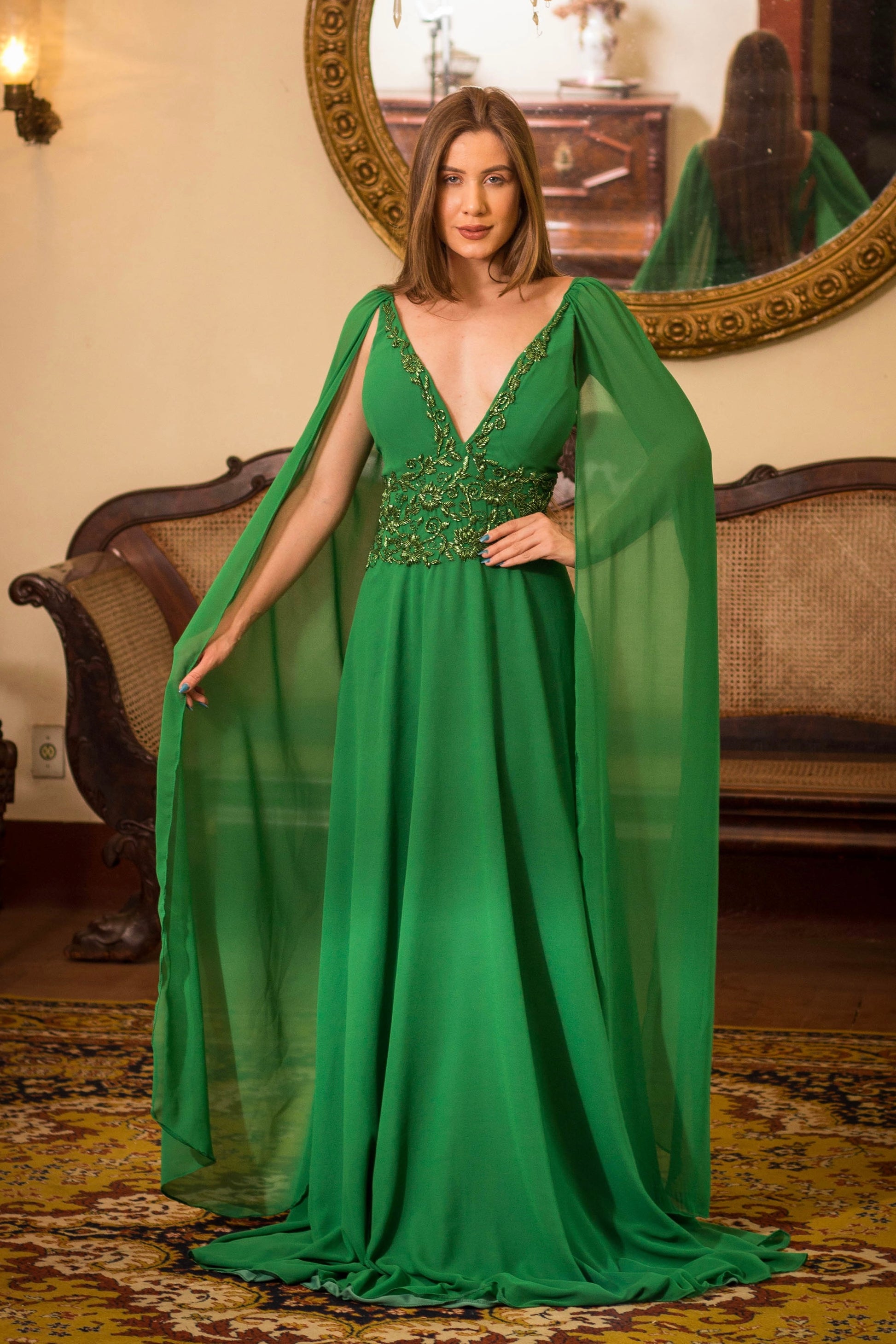 Silk-Touch GGT Crepe Dress with Long Capes and Hand-Embroidered Details.