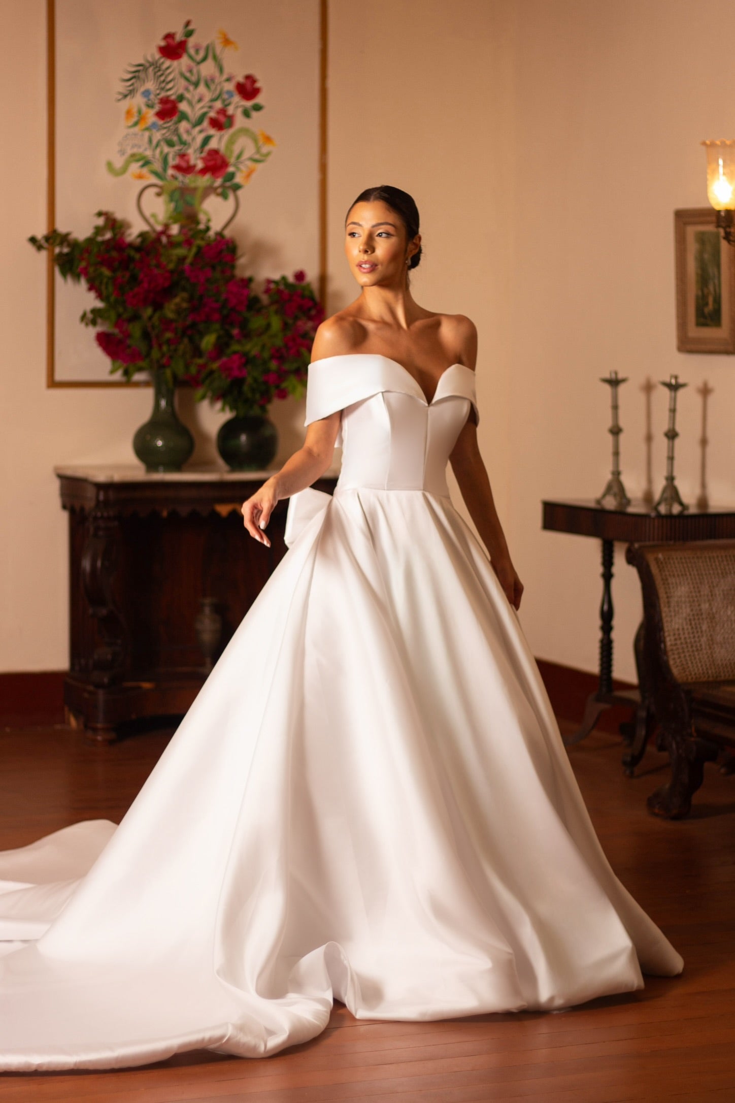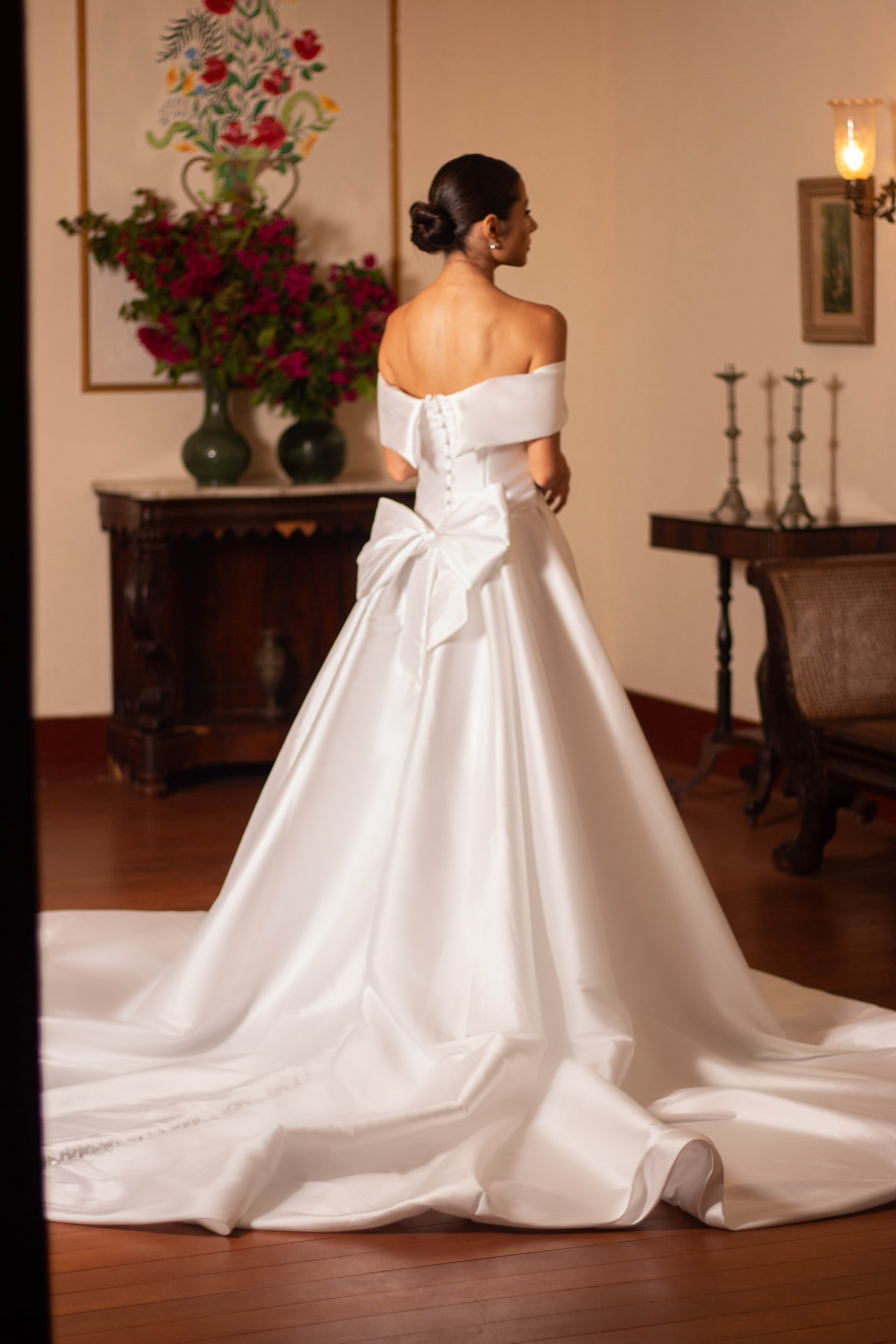 Off-the-shoulder wedding dress with bow, long train, and pearl appliqués on the back.