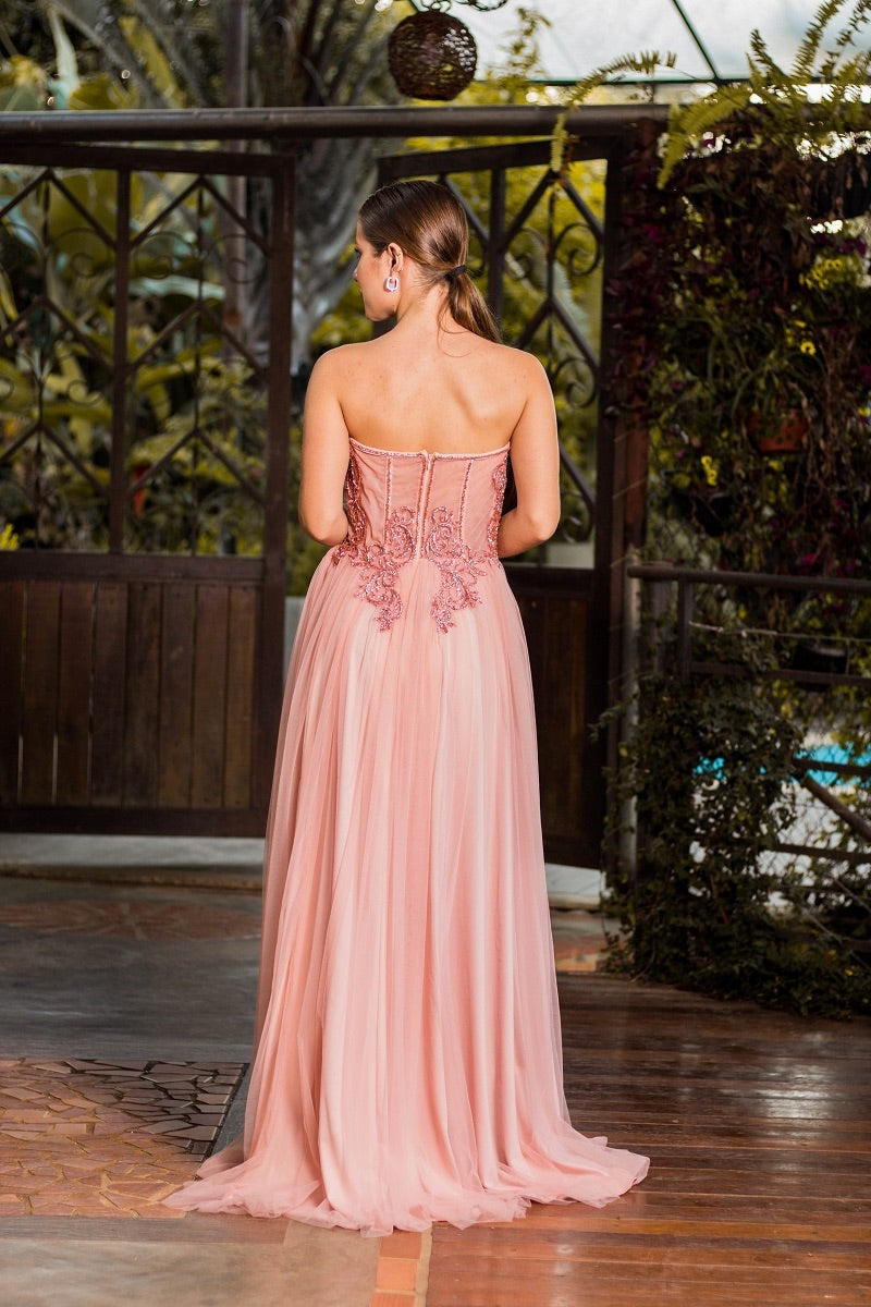 Tulle Dress with Laced Corset, Hand-Embroidered Details, and a Slit.