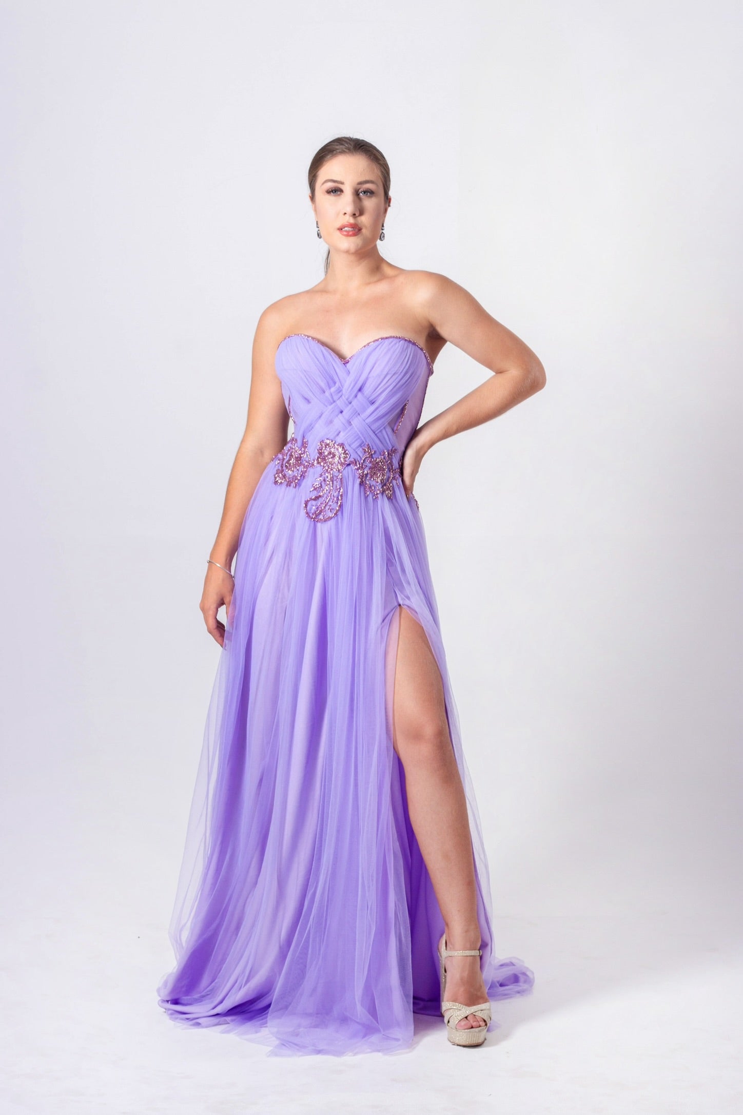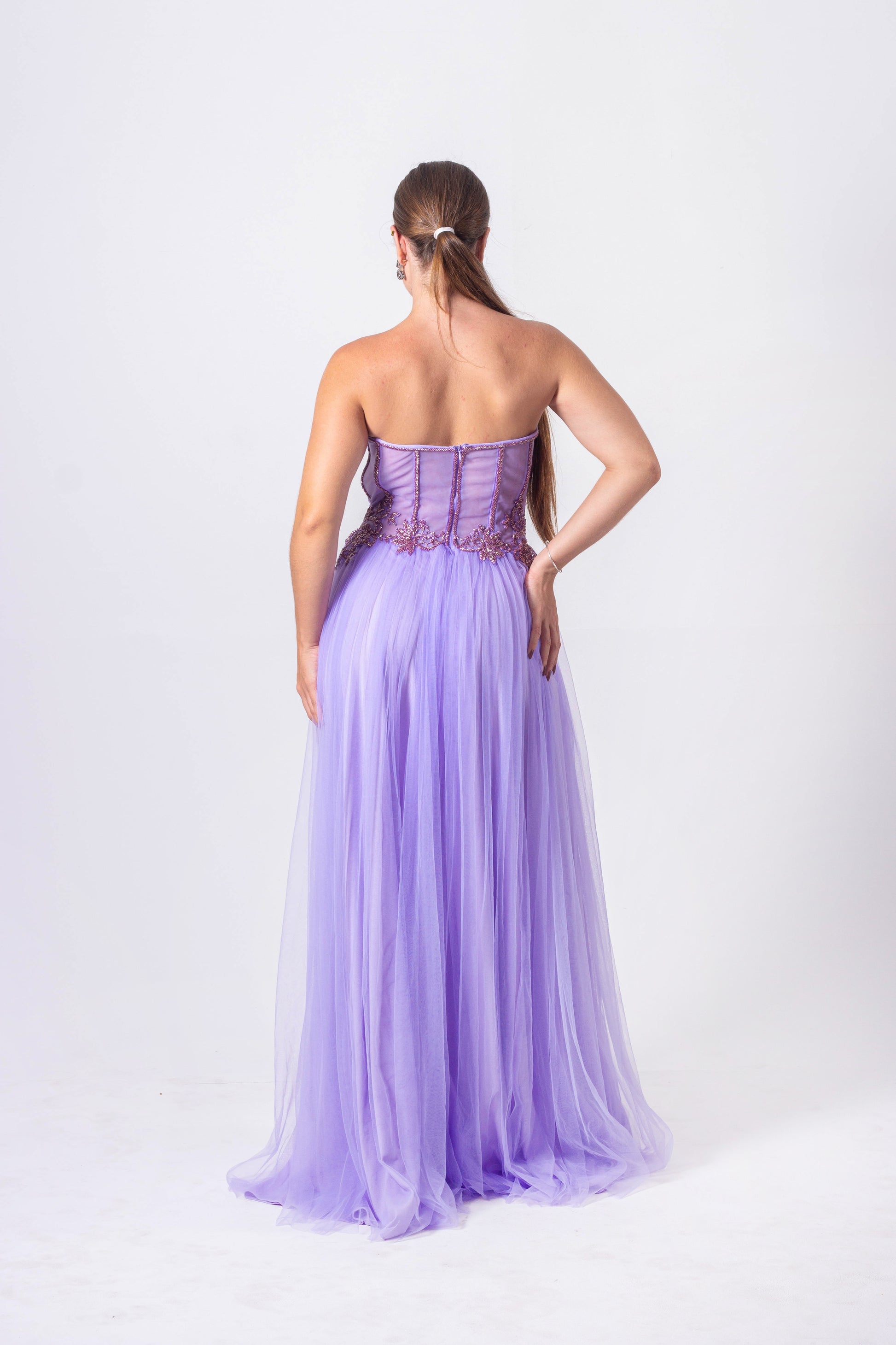 Tulle Dress with Laced Corset, Hand-Embroidered Details, and a Slit.