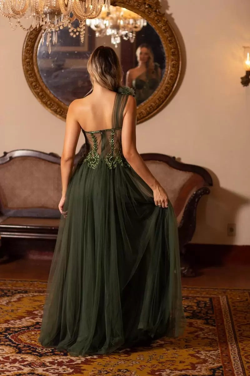 One-Shoulder Tulle Dress with Corset Bodice and Hand-Embroidered Details.