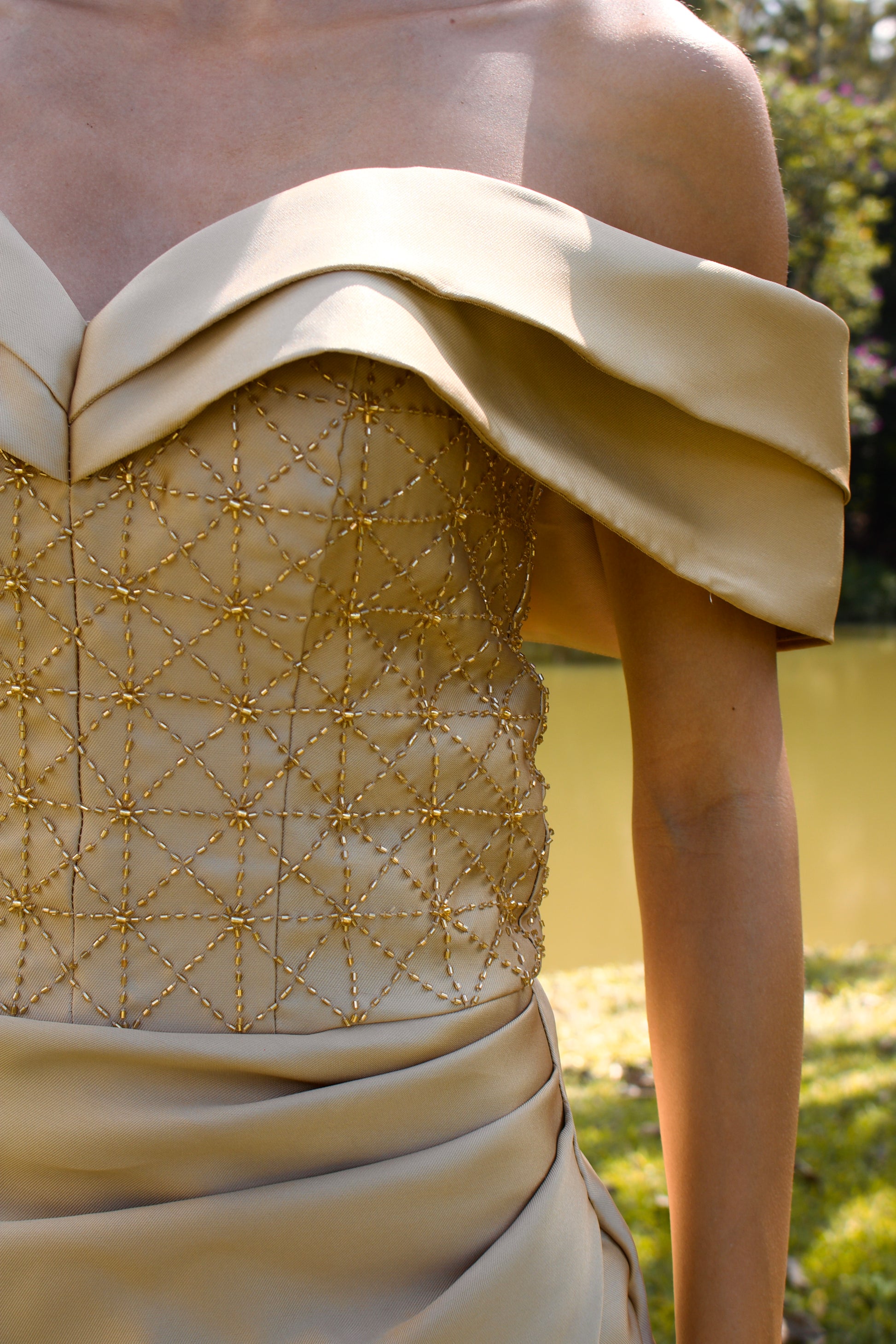 Off-Shoulder Mermaid Zibeline Dress with Hand-Embroidered Details and Slit