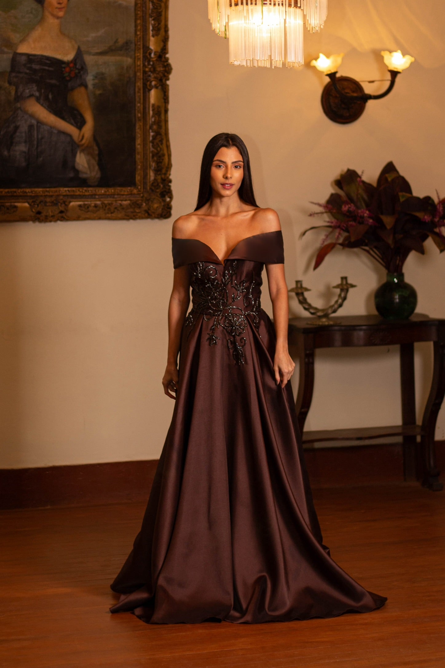 Off-the-shoulder zibeline dress with hand-embroidered details.