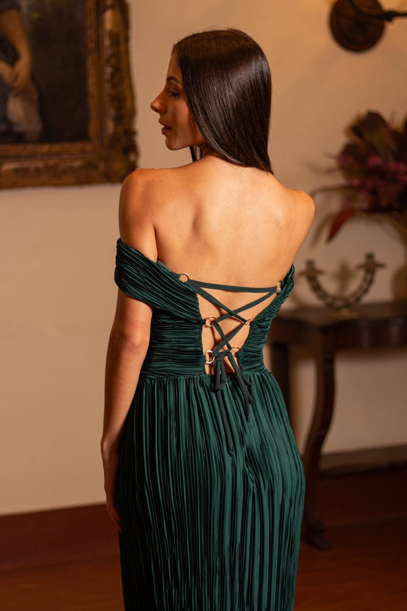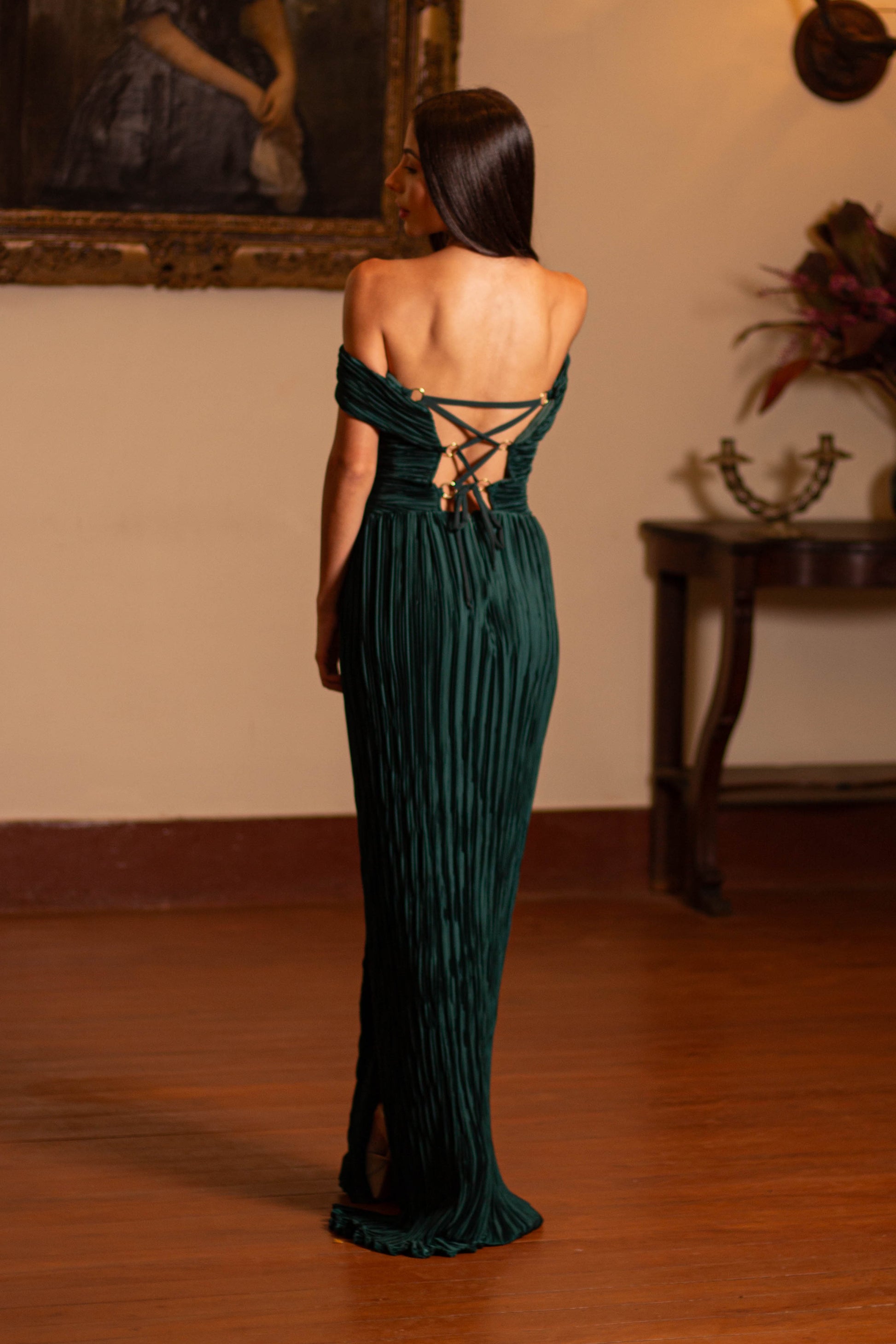 Off-the-shoulder asymmetric draped dress with a slit and lace-up back.