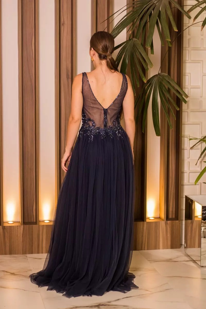 Dress in Tulle with Wide Straps, Hand-Embroidered Details, and a Slit.