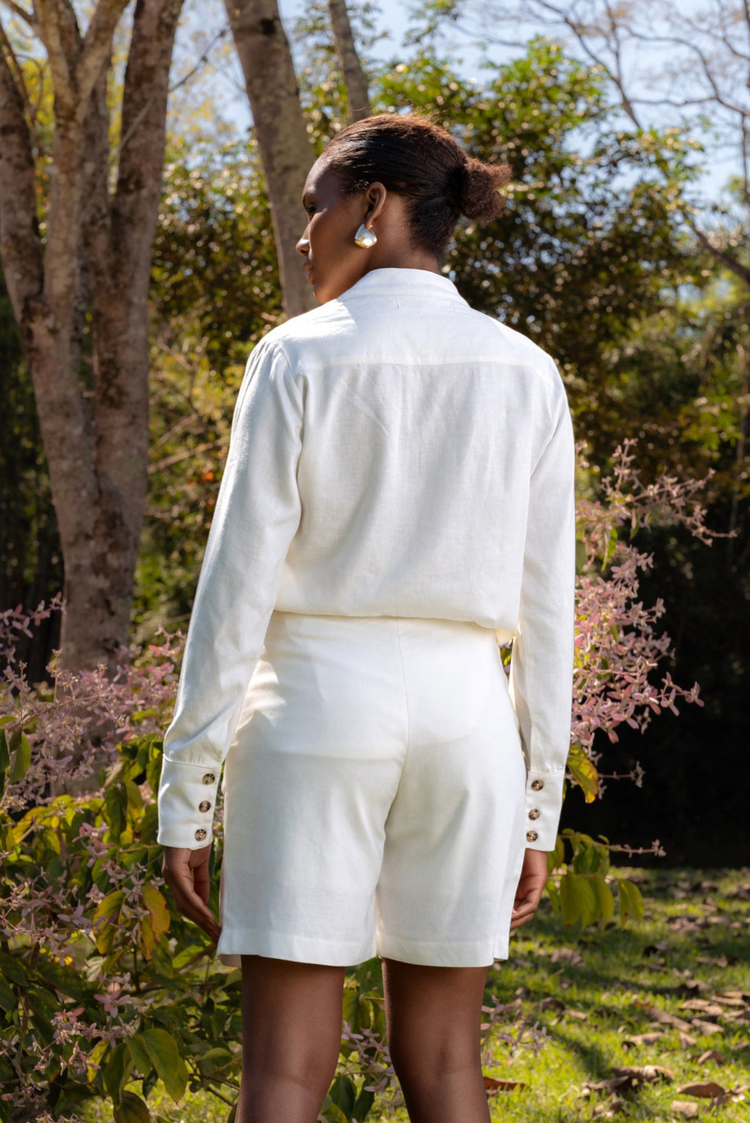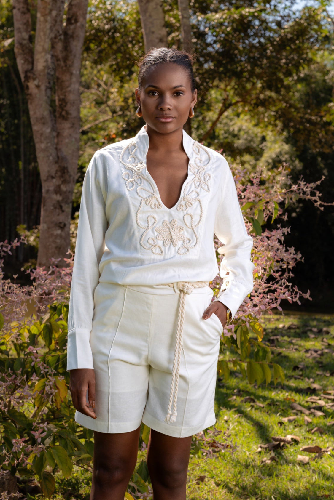 Relaxed and chic, these linen shorts come with a rope belt that adds an artisanal touch and defines the waist. Designed with a comfortable fit and breathable fabric, they are perfect for summer days, vacations, or casual yet sophisticated looks when paired with linen tops or blazers.