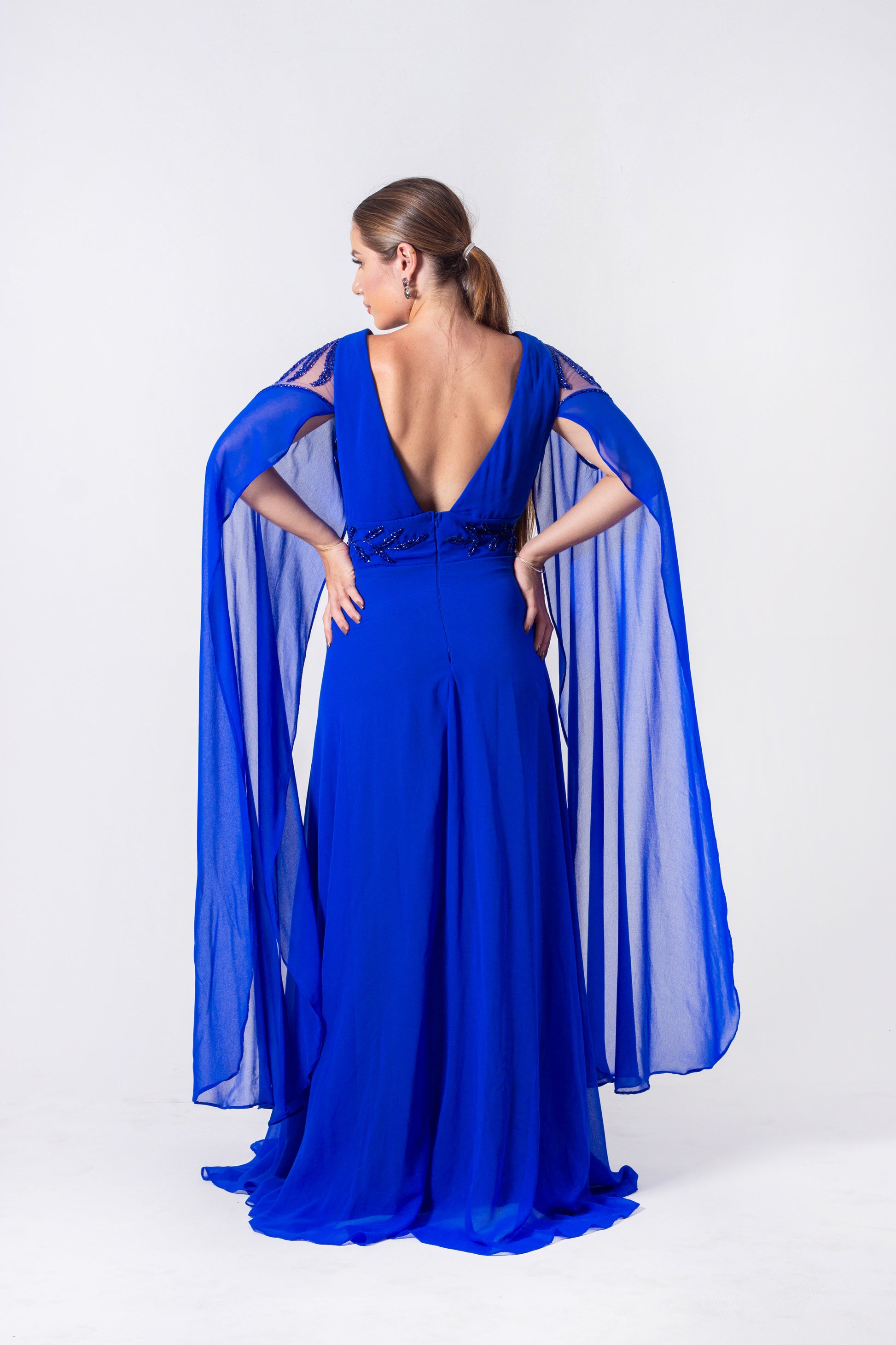 Silk-Touch GGT Crepe Dress with Long Capes and Hand-Embroidered Details.