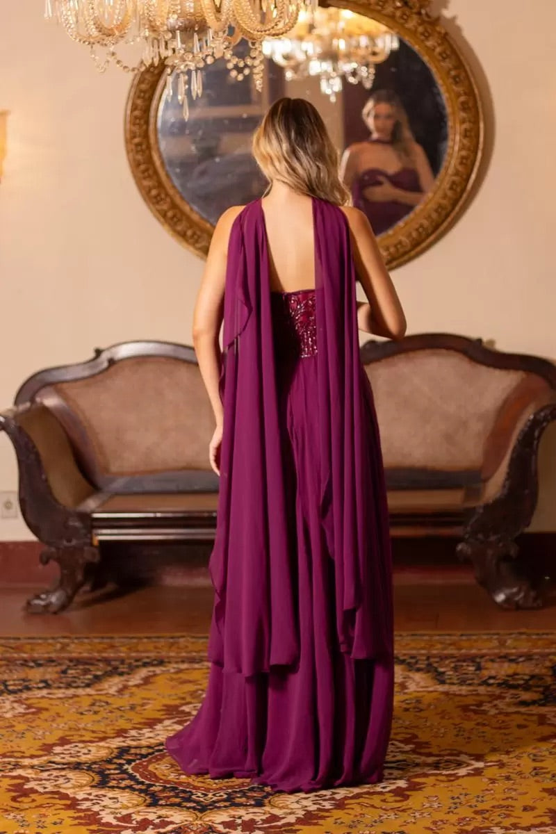 Silk-Touch GGT Crepe Dress with Corset Bodice, Removable Long Cape, and Hand-Embroidered Details.