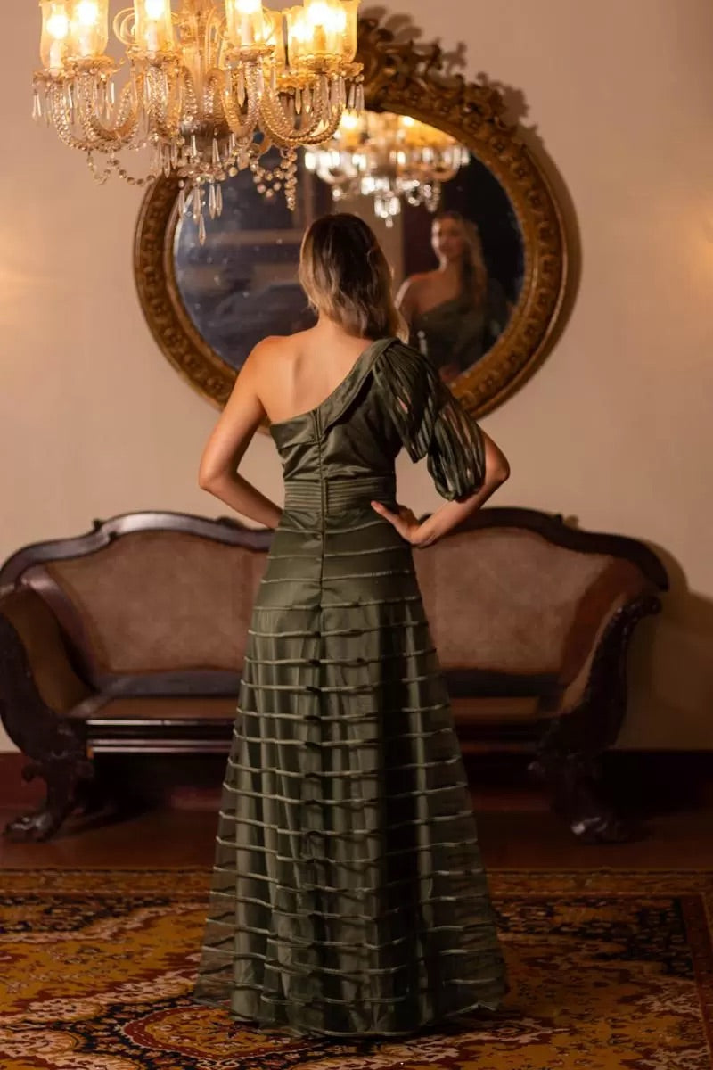 One-Shoulder Bias-Cut Dress with Detailed Sleeve.