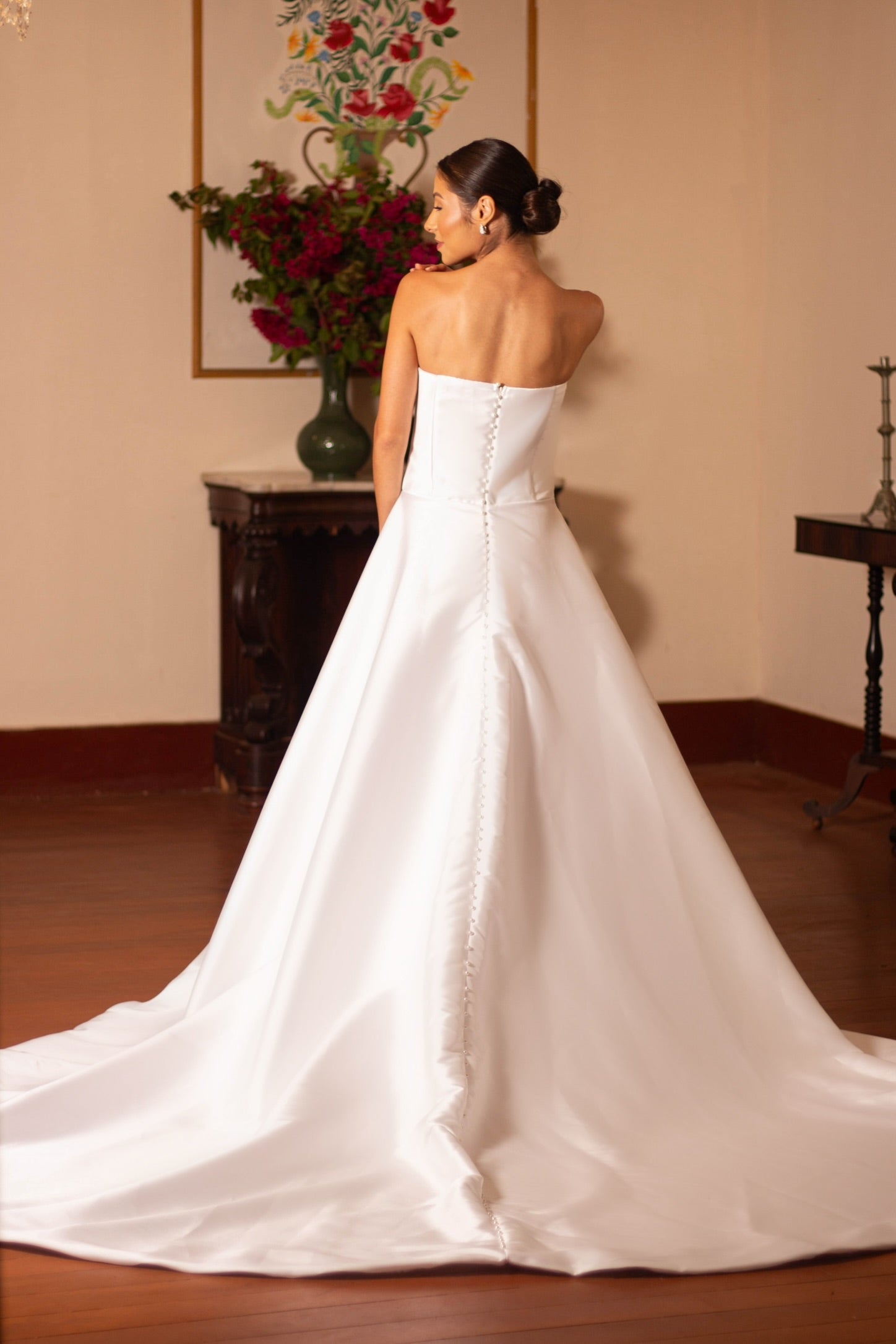Wedding dress with bow, long train, and pearl appliqués on the back.