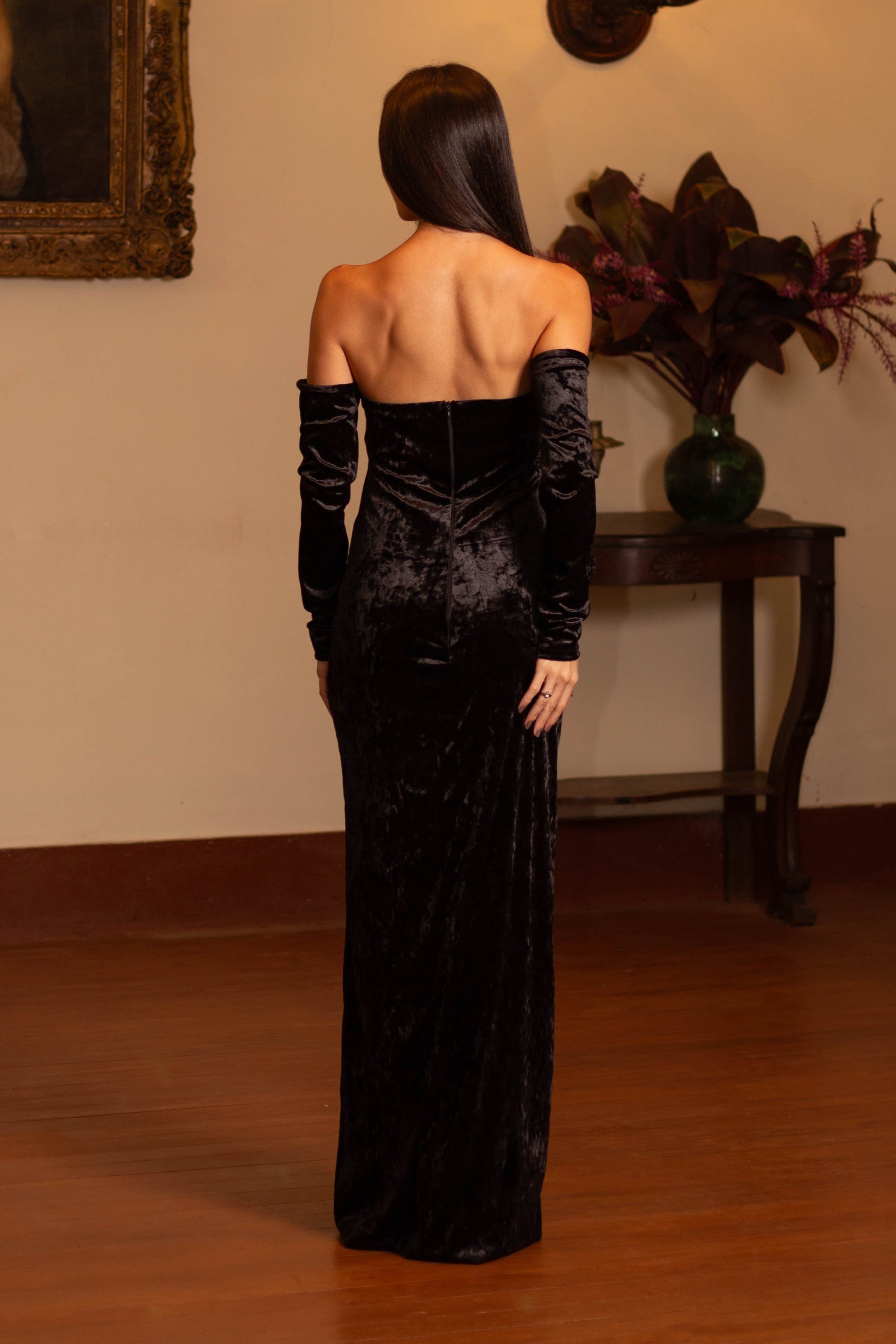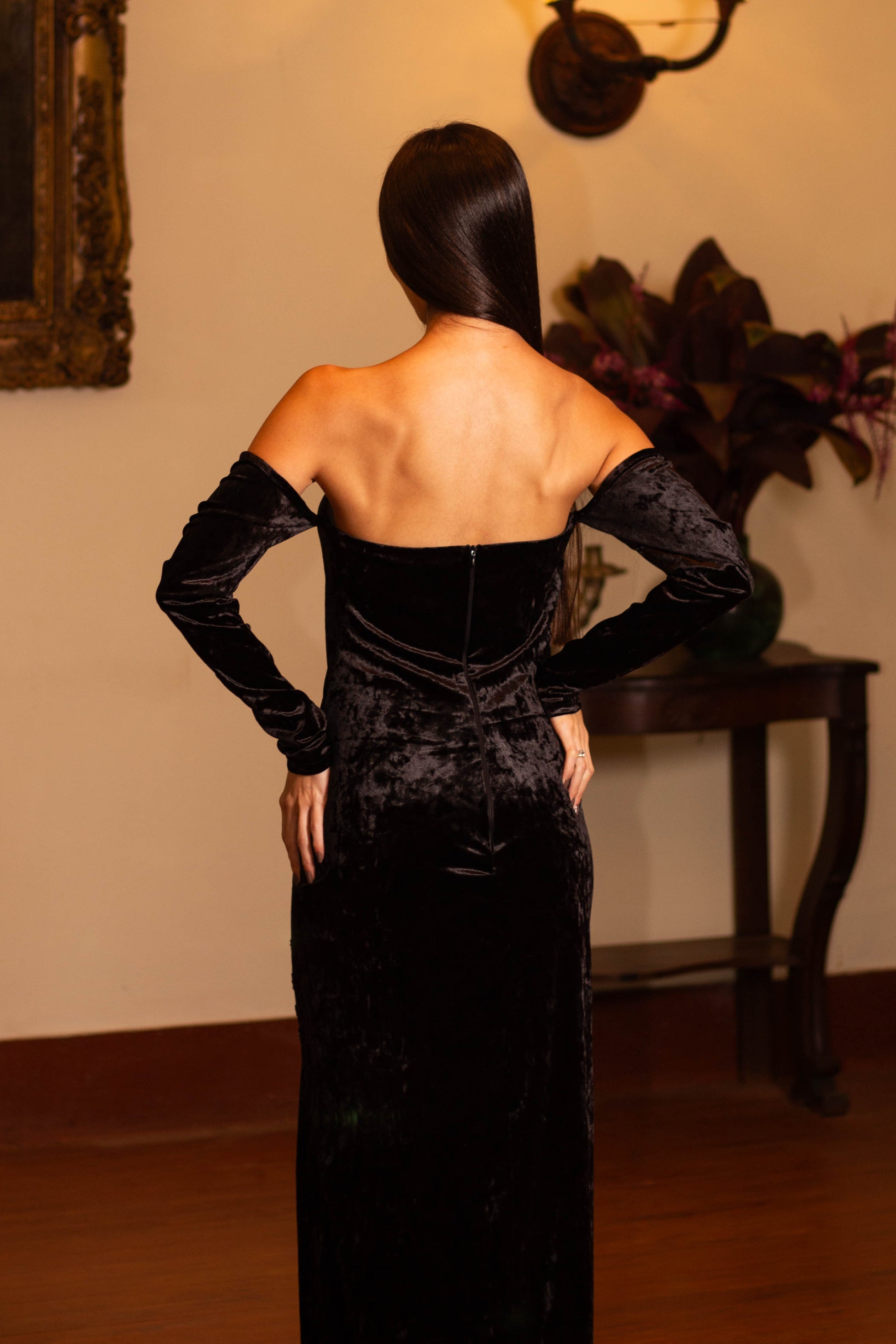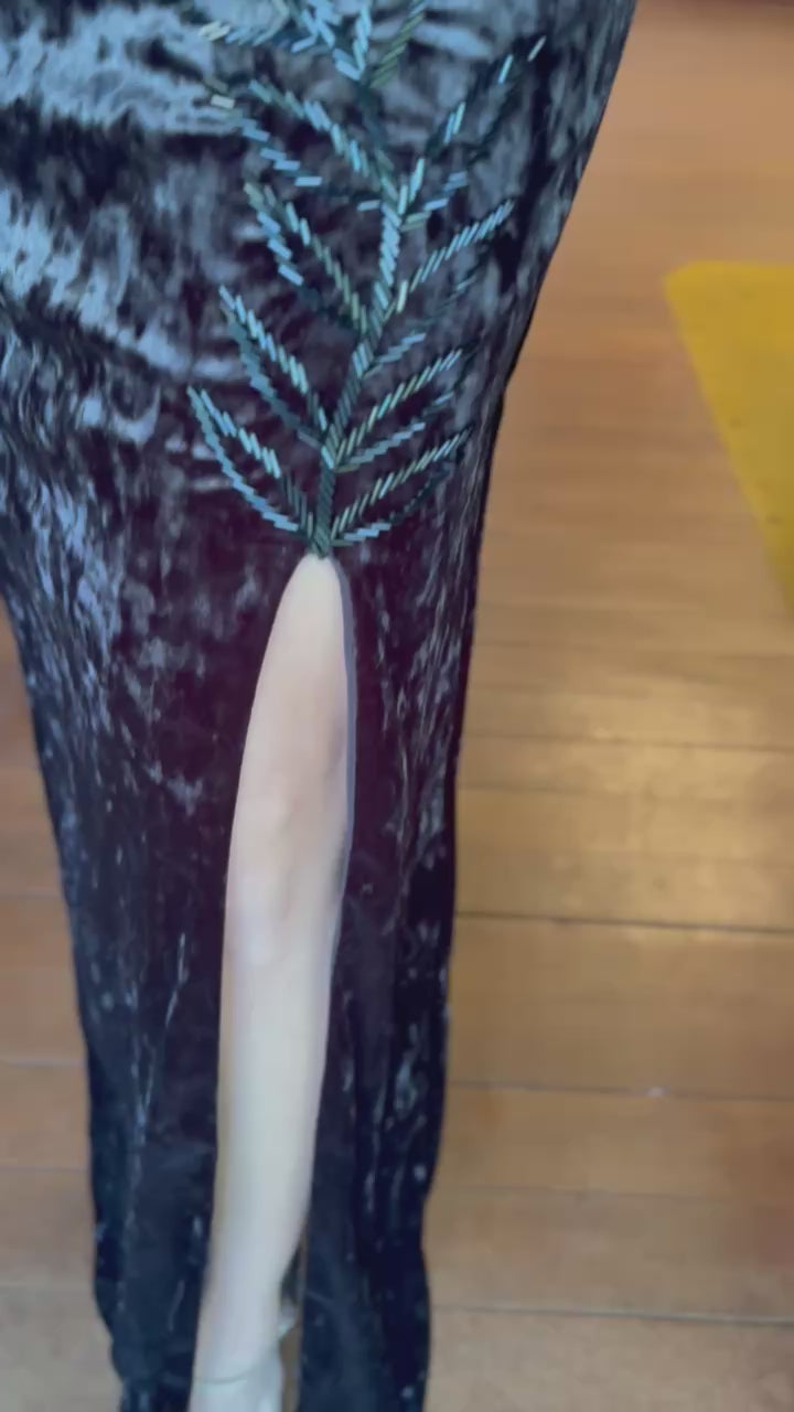 Off-the-Shoulder Velvet Dress with Long Sleeves, Hand Embroidery, and a Slit.