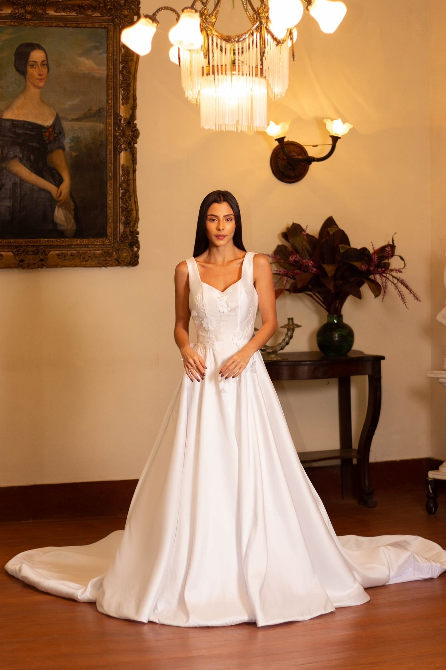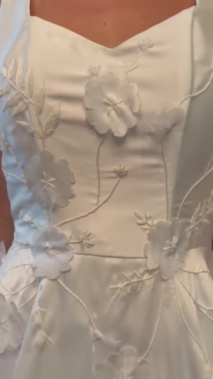 Bridal Gown with Wide Straps, Long Train, Thread Embroidery, and 3D Floral Appliqués.