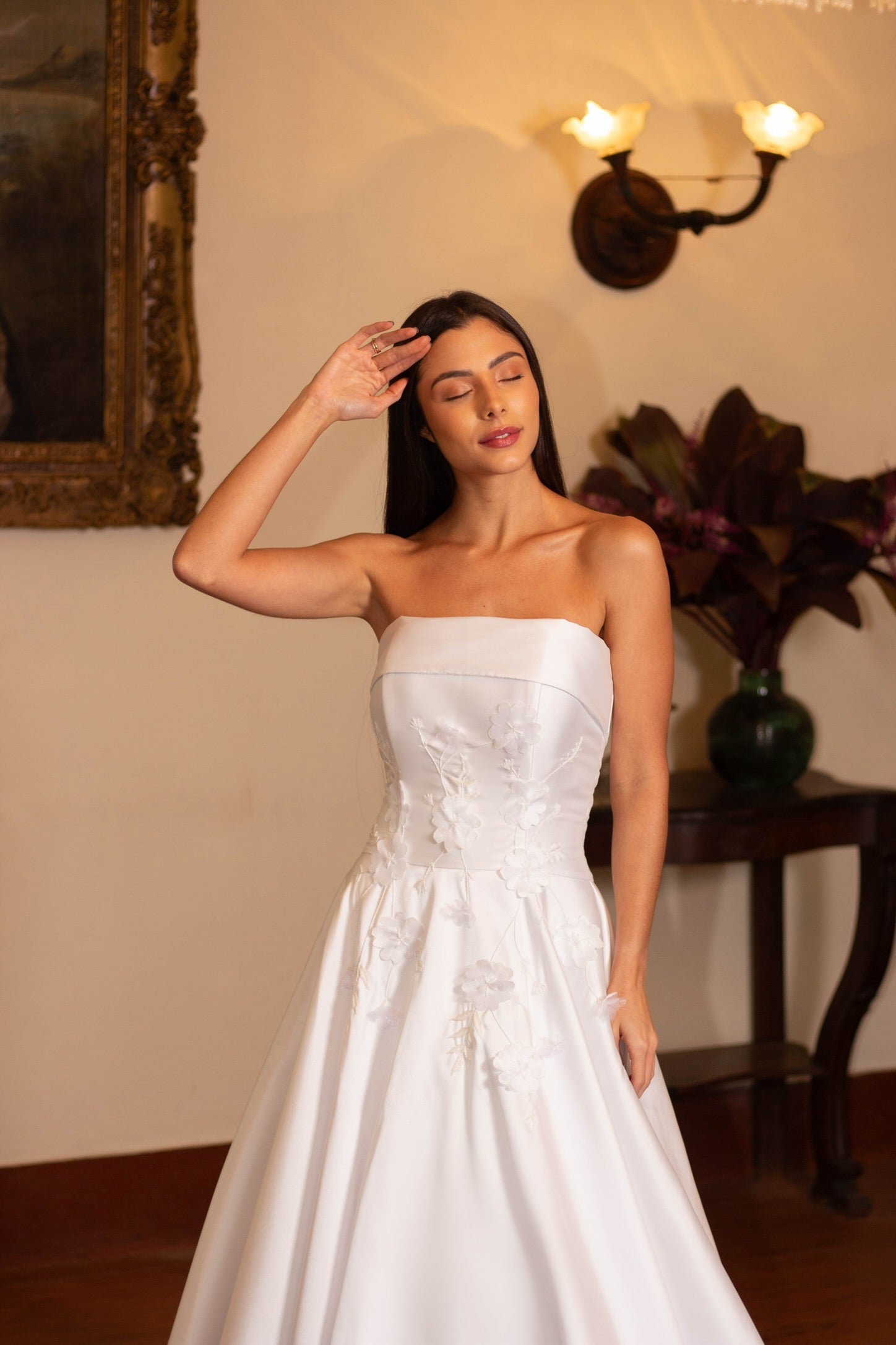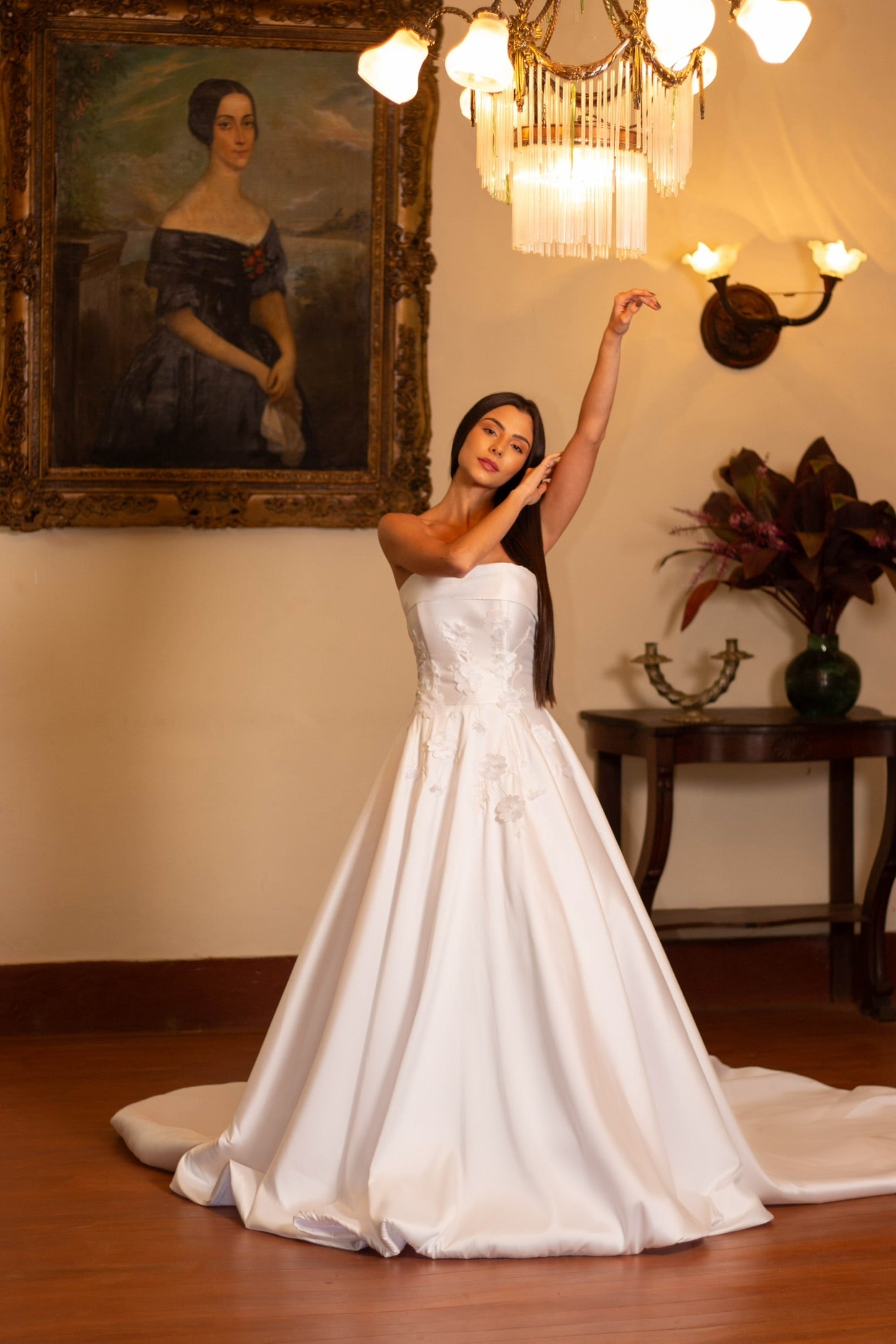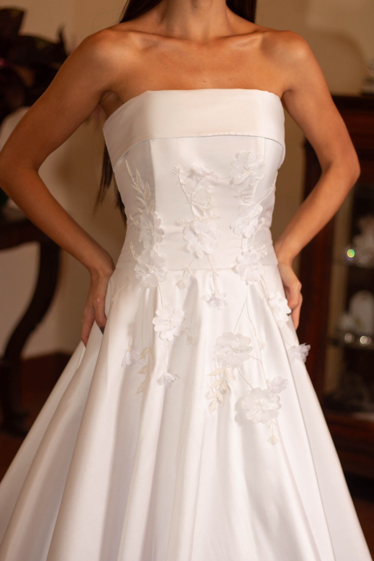 Strapless Bridal Gown with Long Train, Thread Embroidery, and Handcrafted Floral Appliqués.
