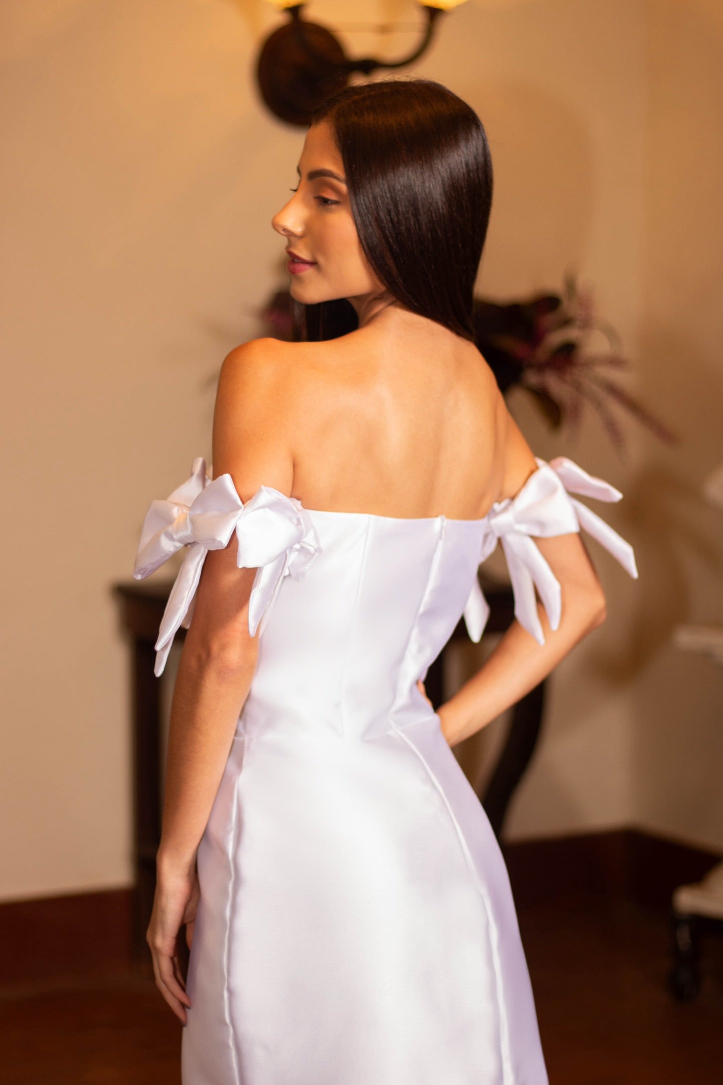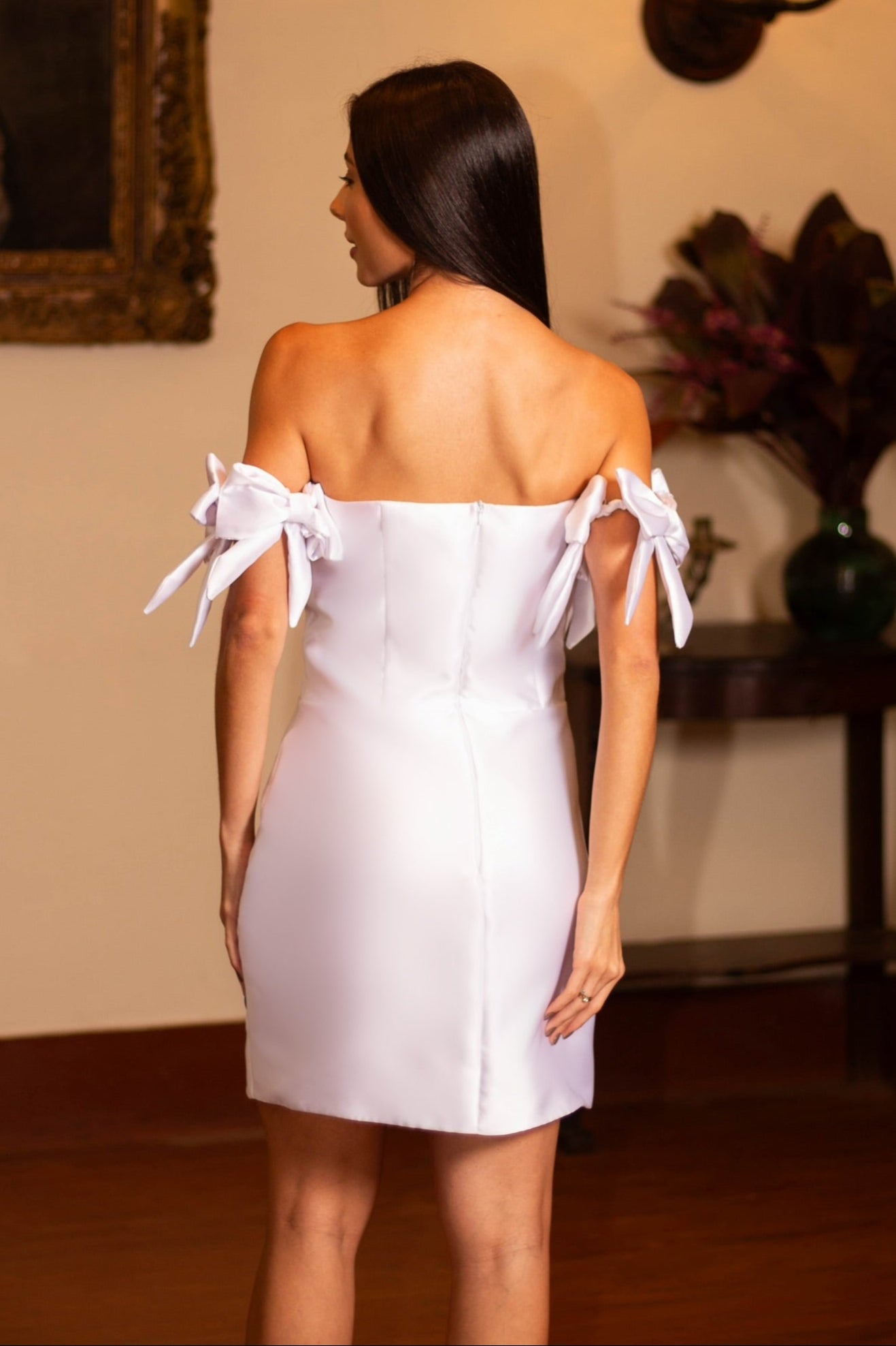 Off-the-Shoulder Short Dress with Bow Appliqués.