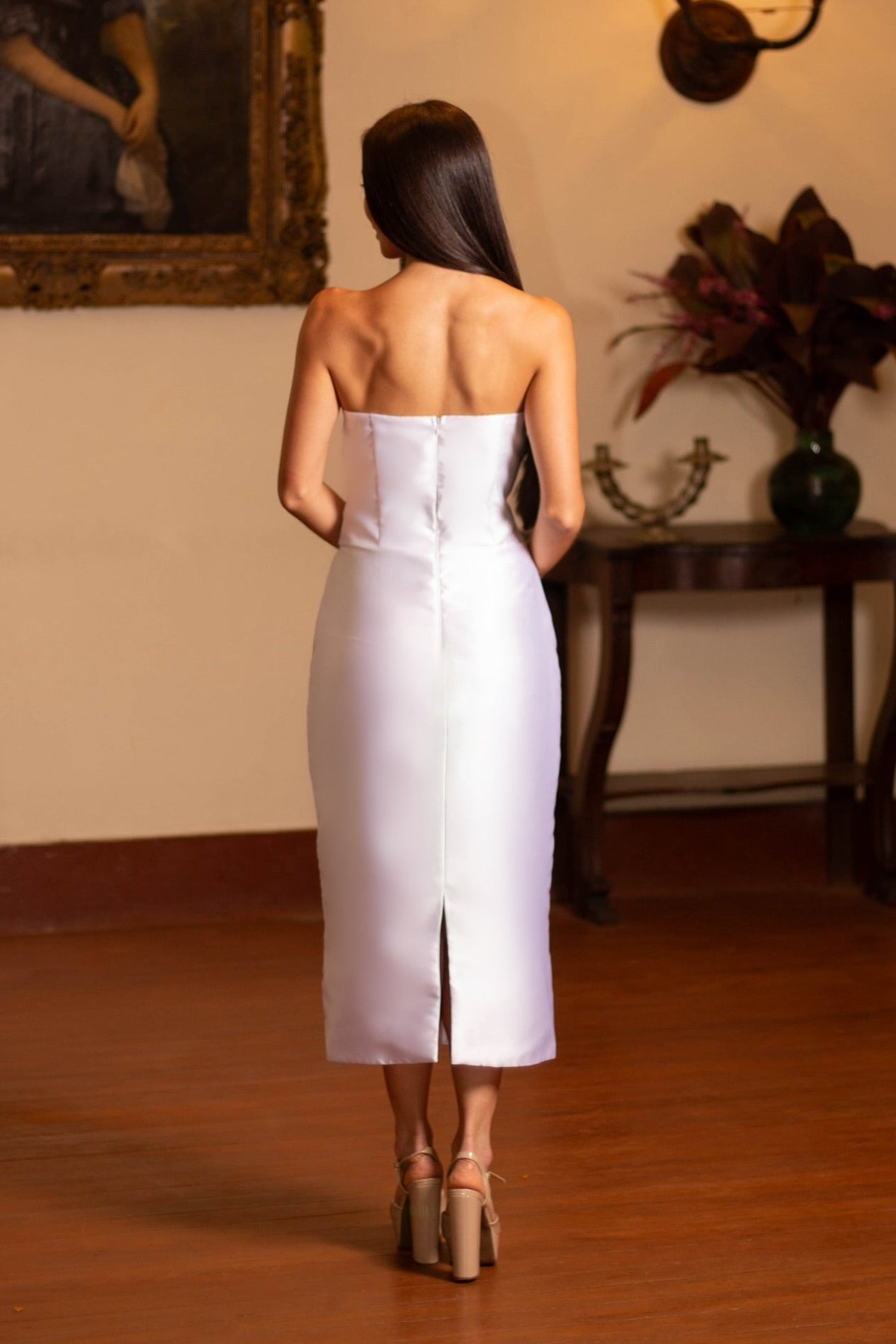 Asymmetrical Strapless Midi Dress with Handcrafted Floral Appliqué.