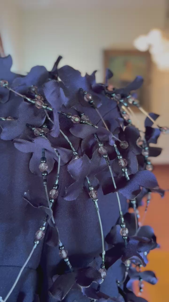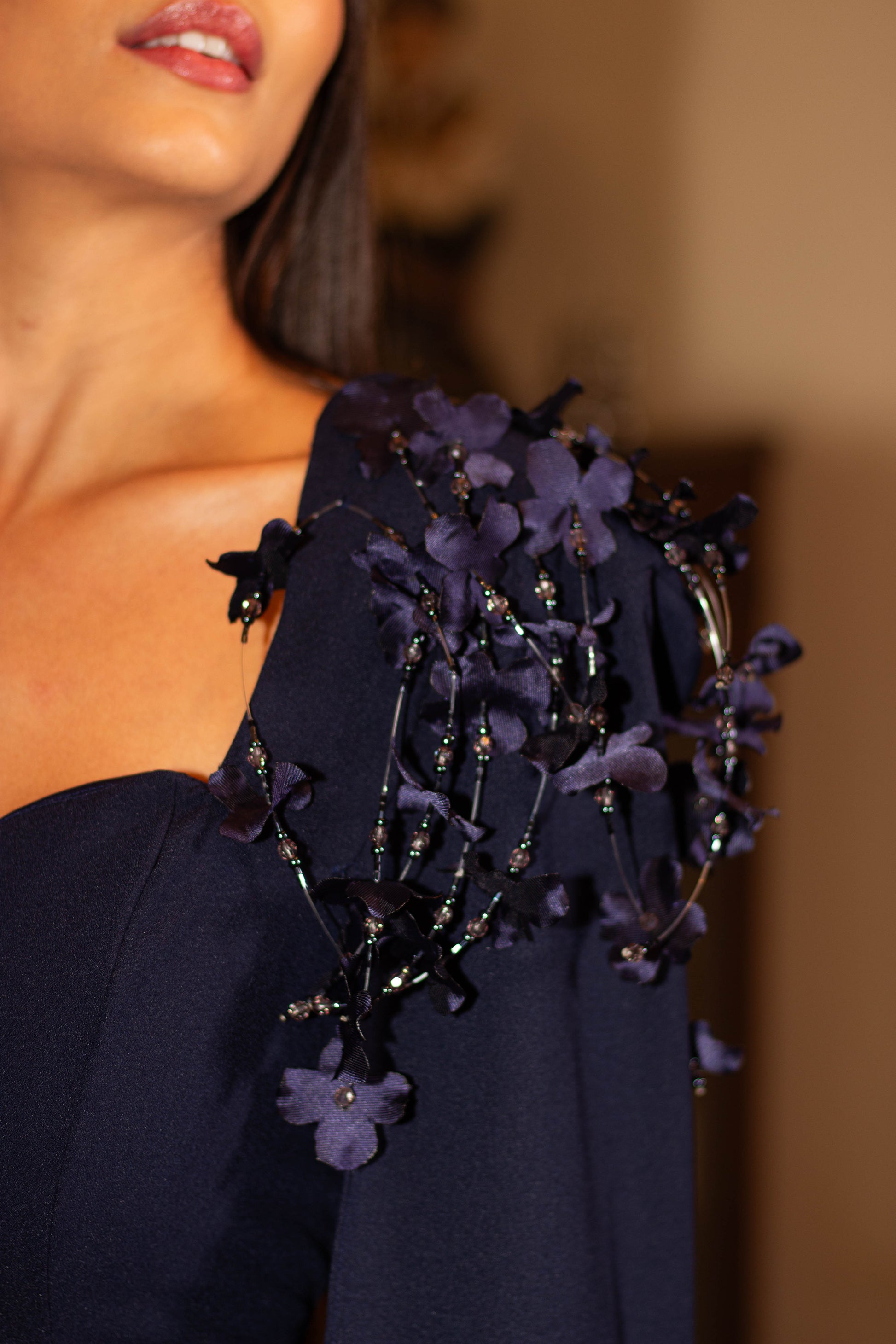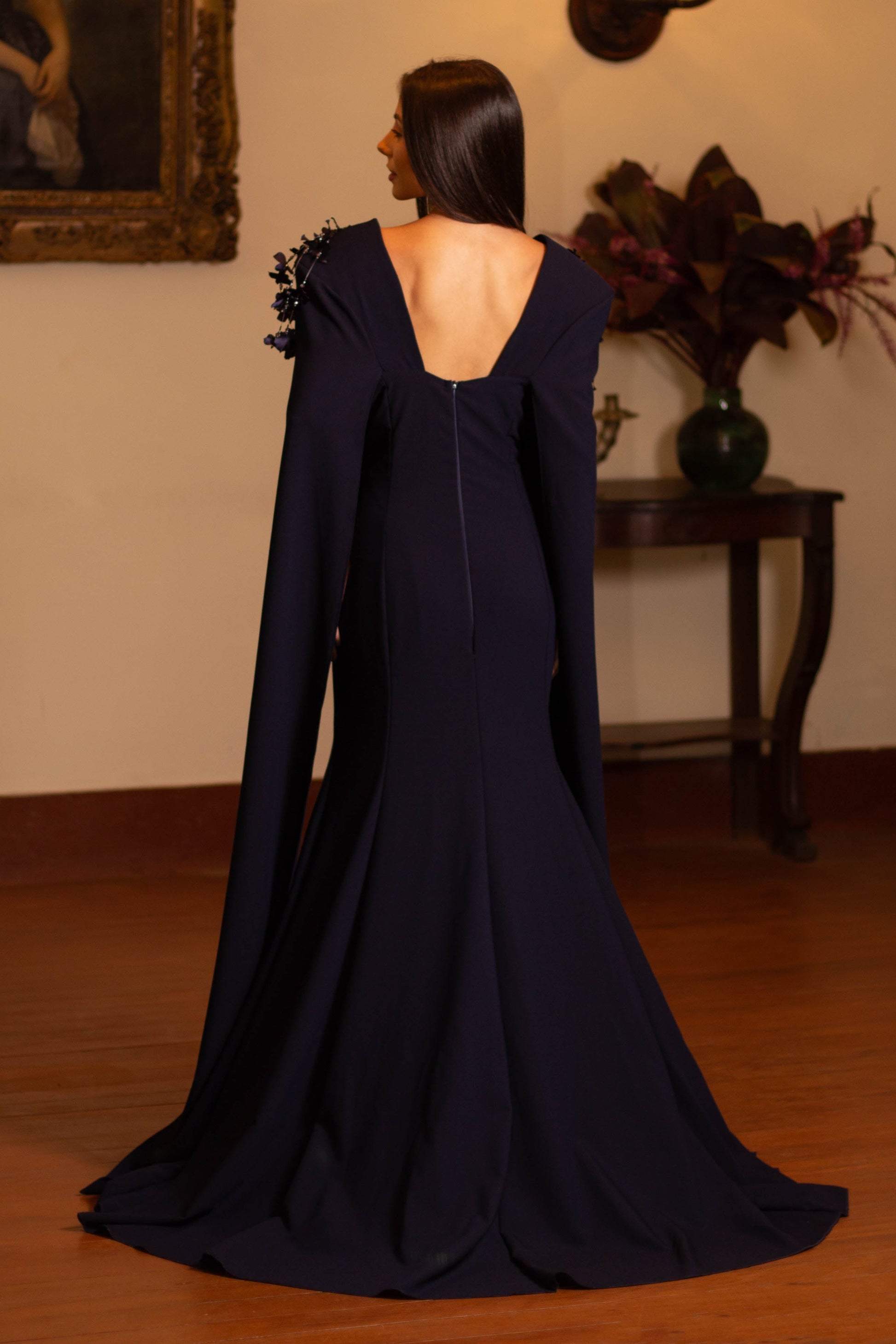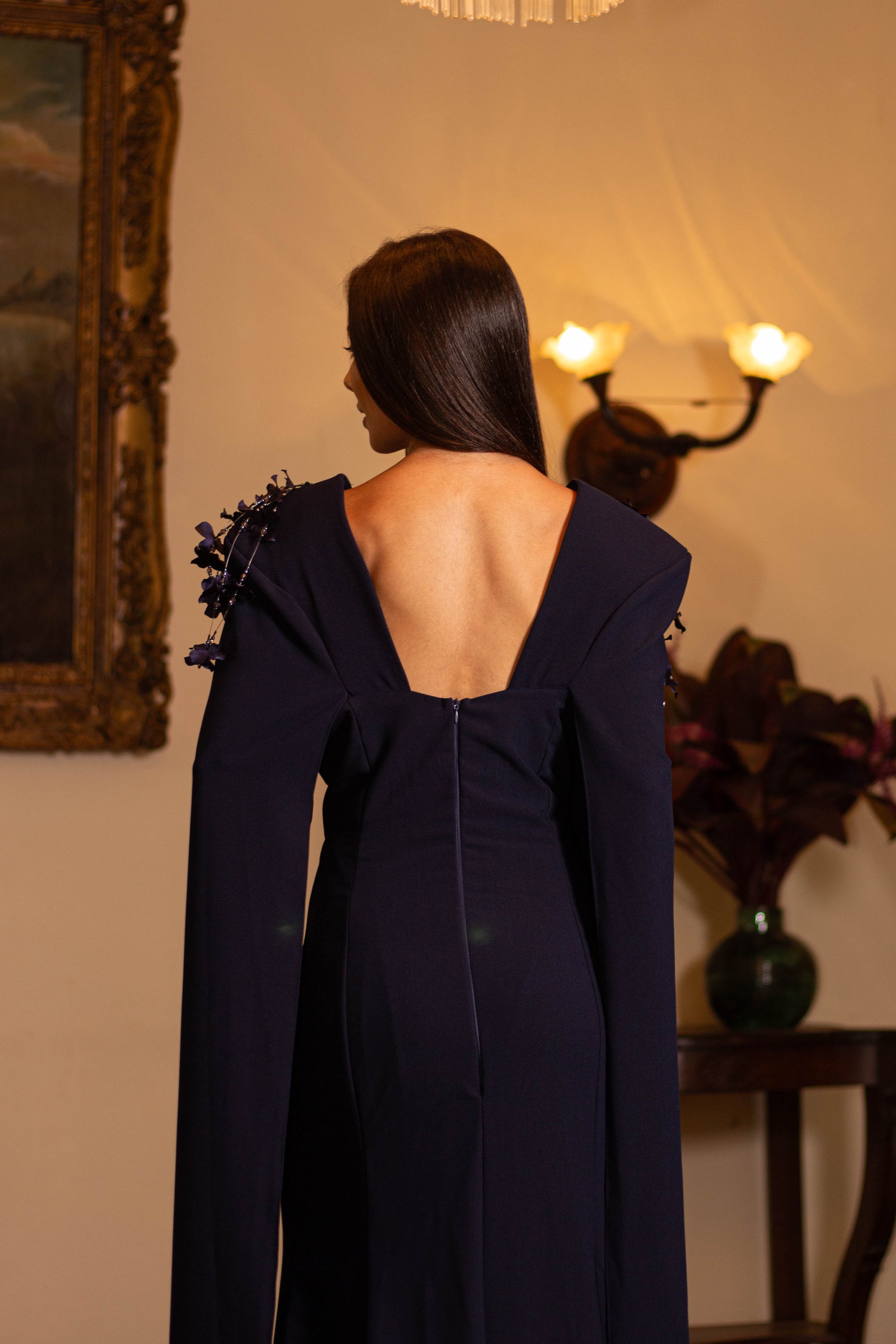 Miu Miu Crepe Tailored Dress with Long Cape, Floral Appliqués, and Embroidered Shoulder Details.